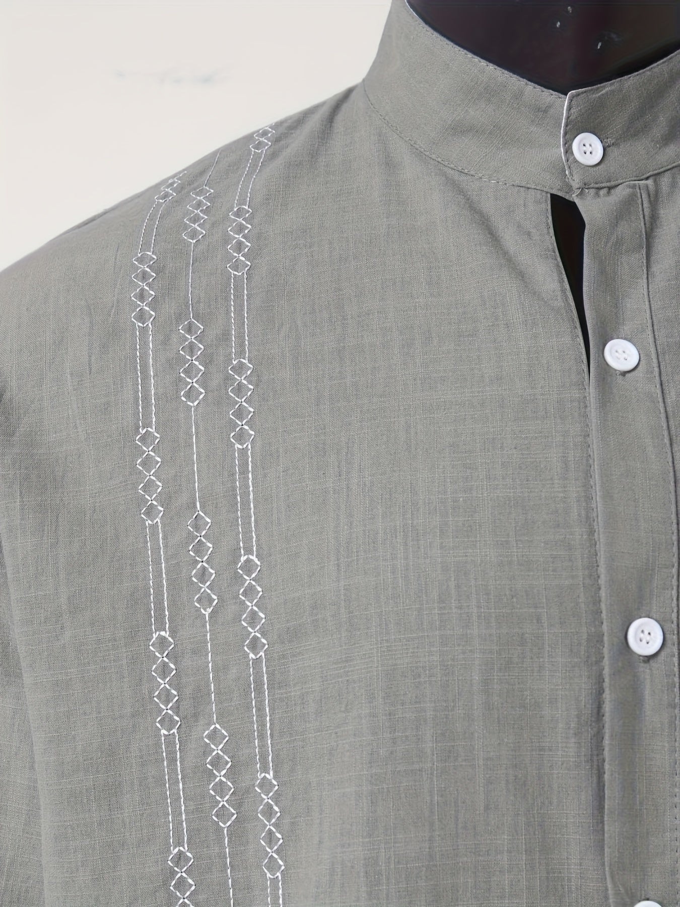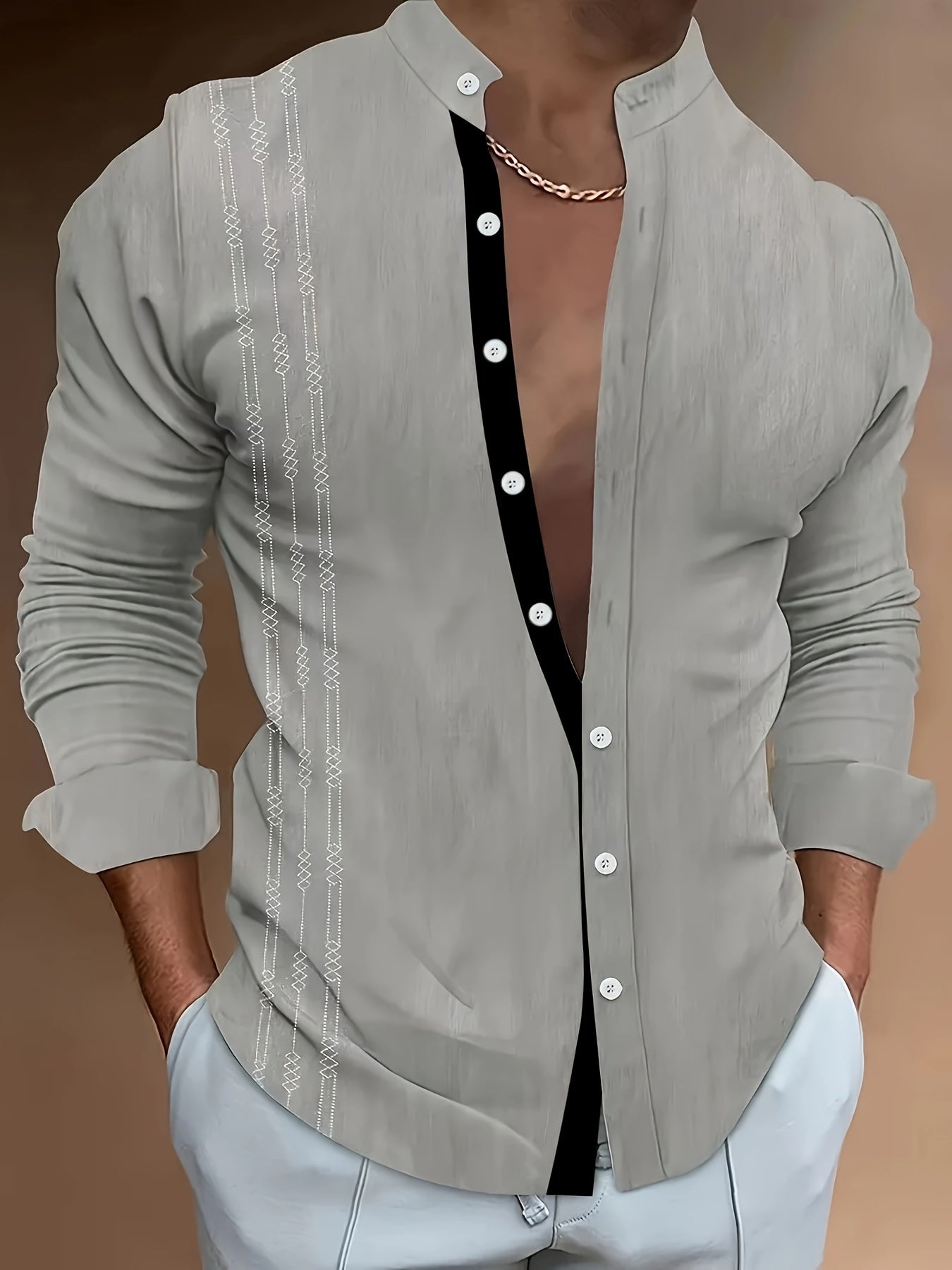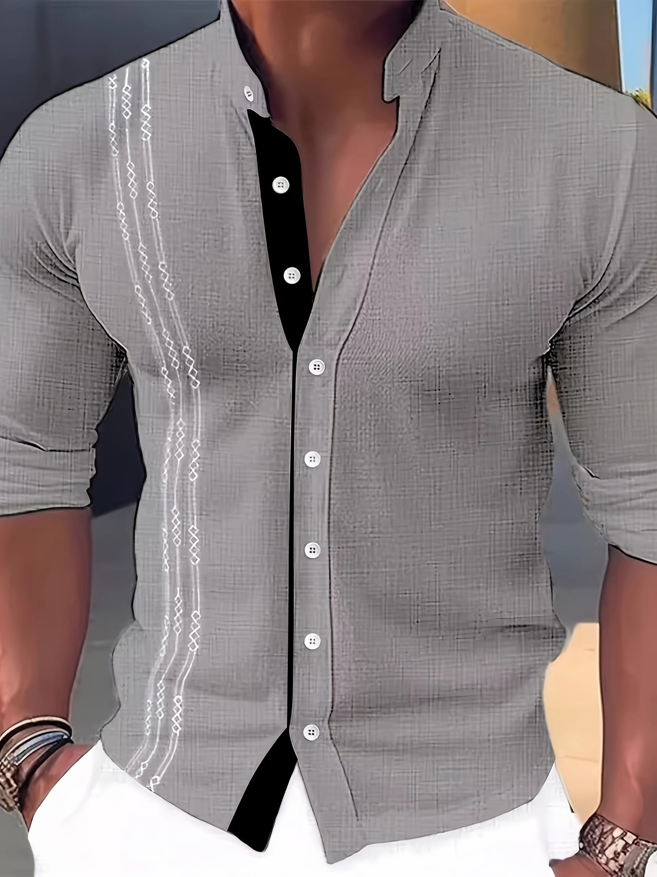 Baumwoll-Leinen Hemd – Langarm Freizeithemd mit Farbblock & Stickerei, Atmungsaktiv