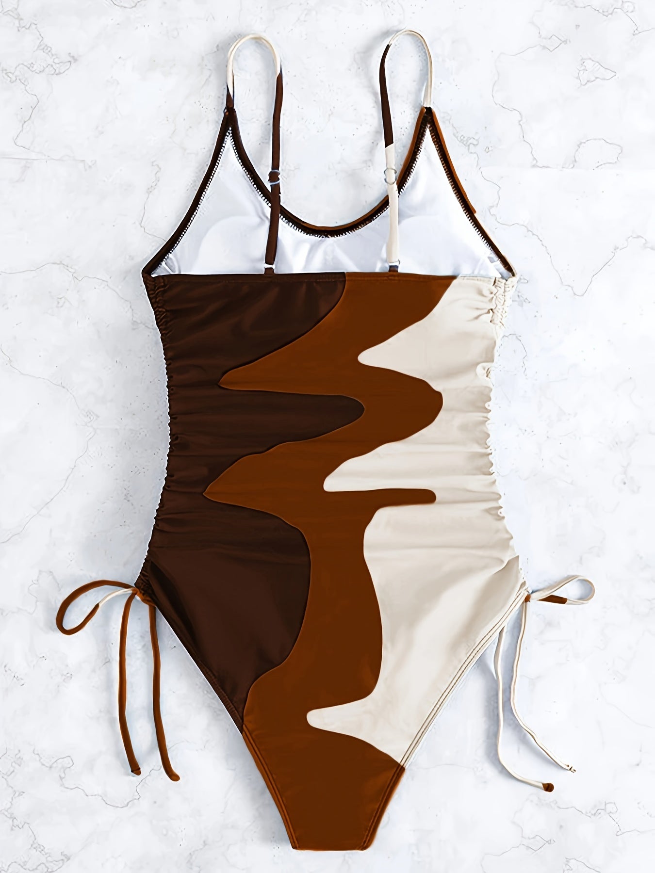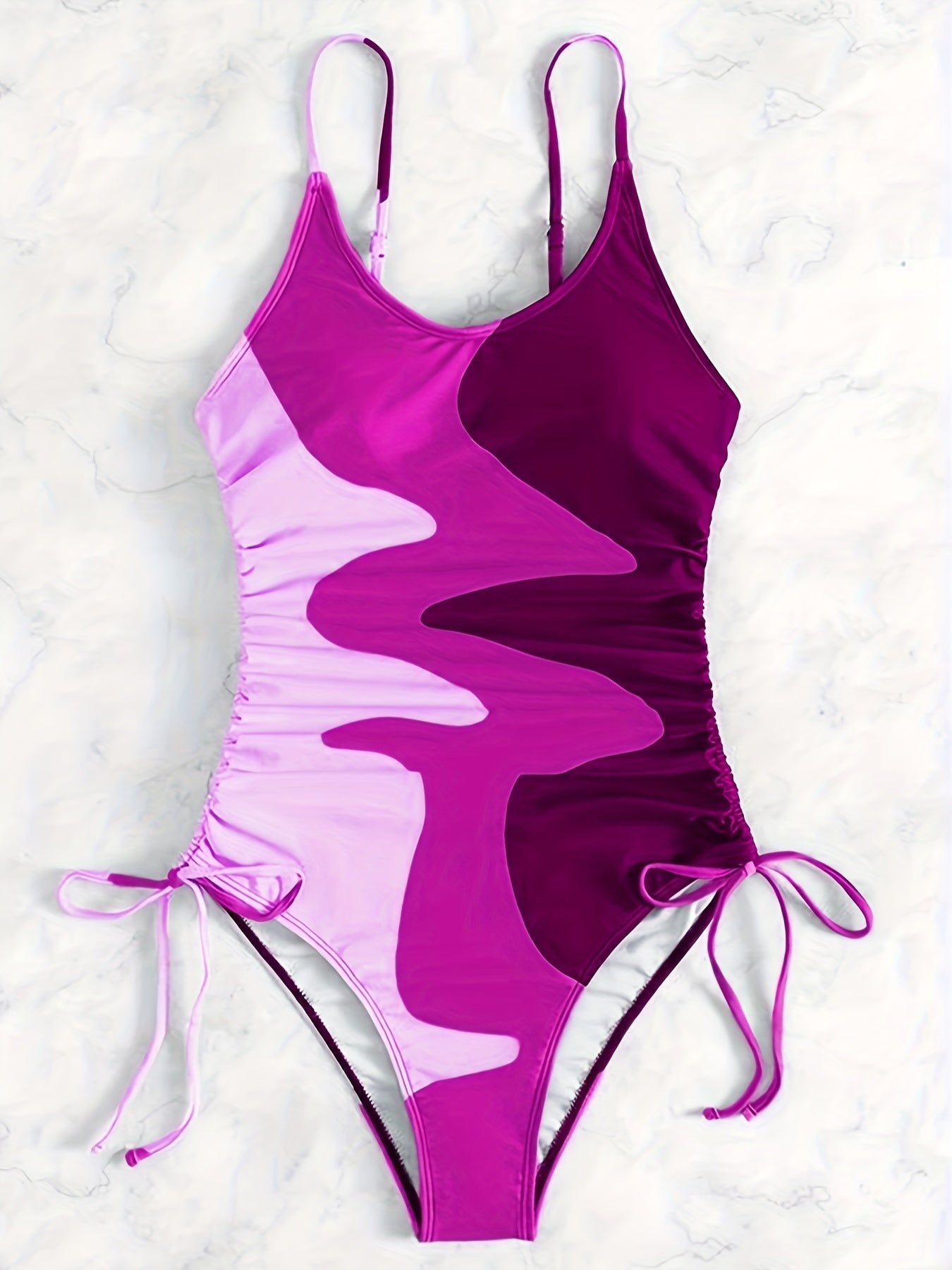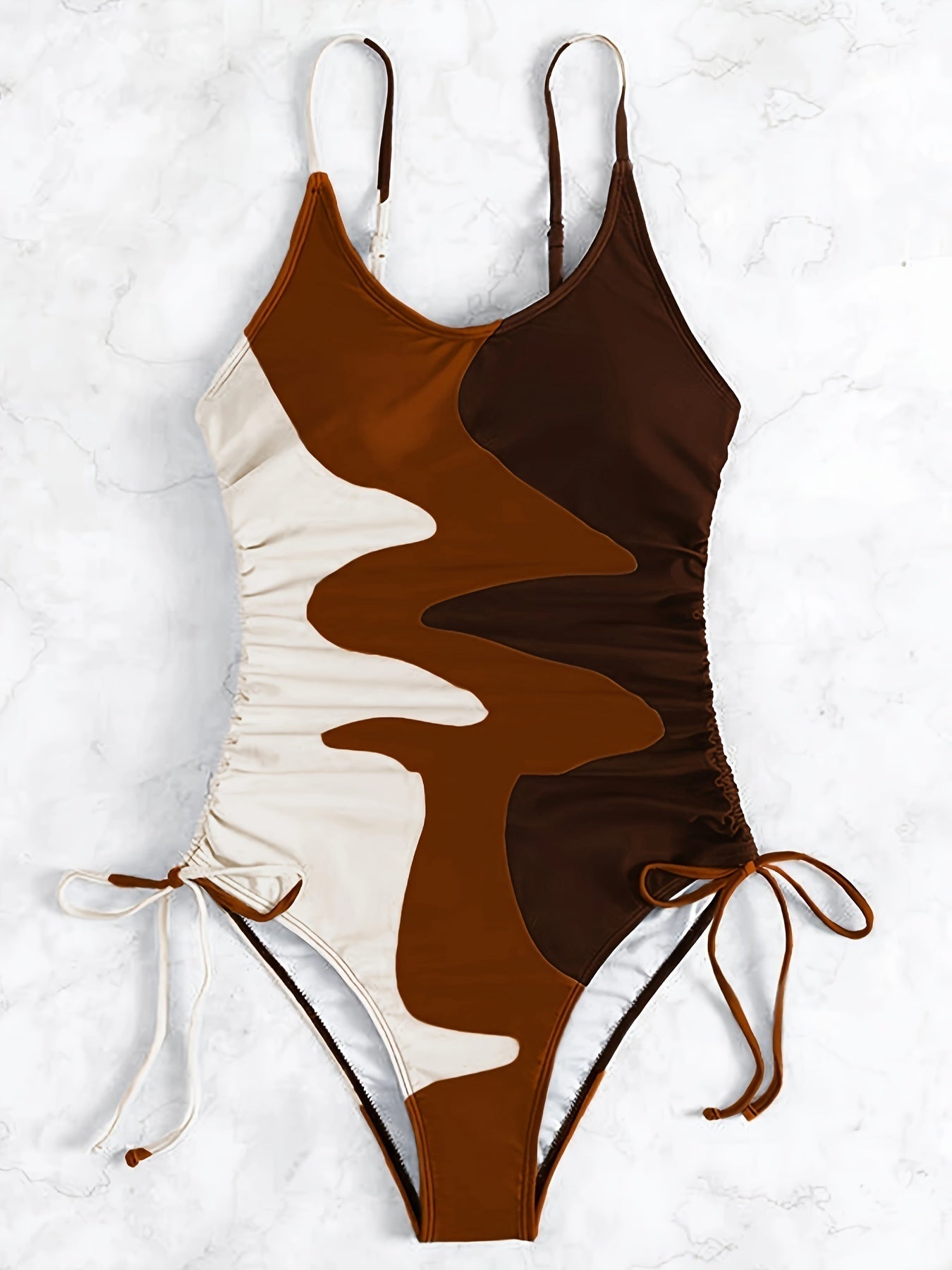 Dieser stilvolle Farbblock-Badeanzug kombiniert Eleganz mit Funktionalität. Das hochelastische Material sorgt für eine bequeme Passform und betont sanft Ihre Figur. Die Spaghettiträger bieten optimalen Halt, während der Kordelzug für eine individuelle Anpassung sorgt. Perfekt für entspannte Tage am Strand oder aktive Stunden im Wasser.