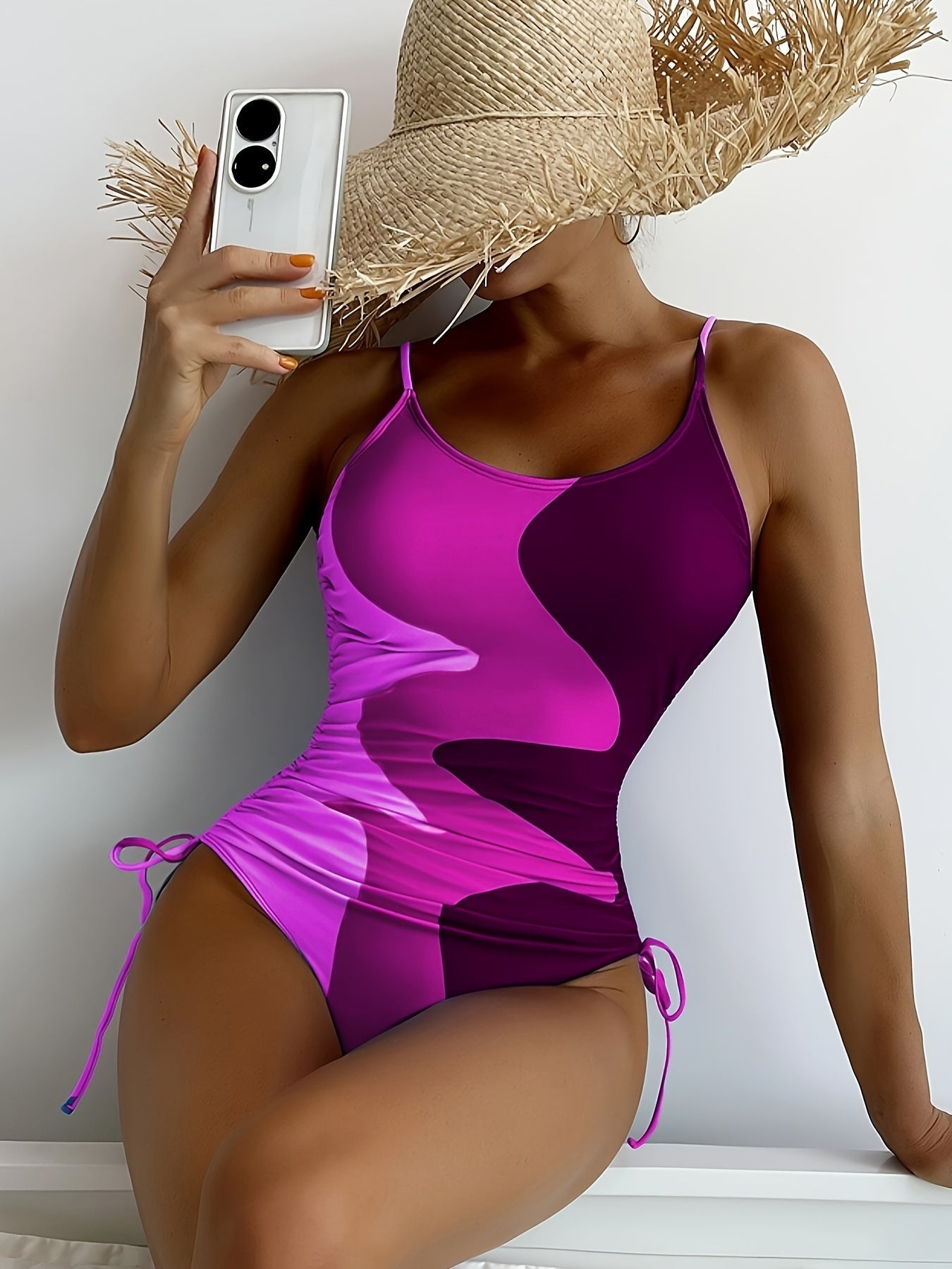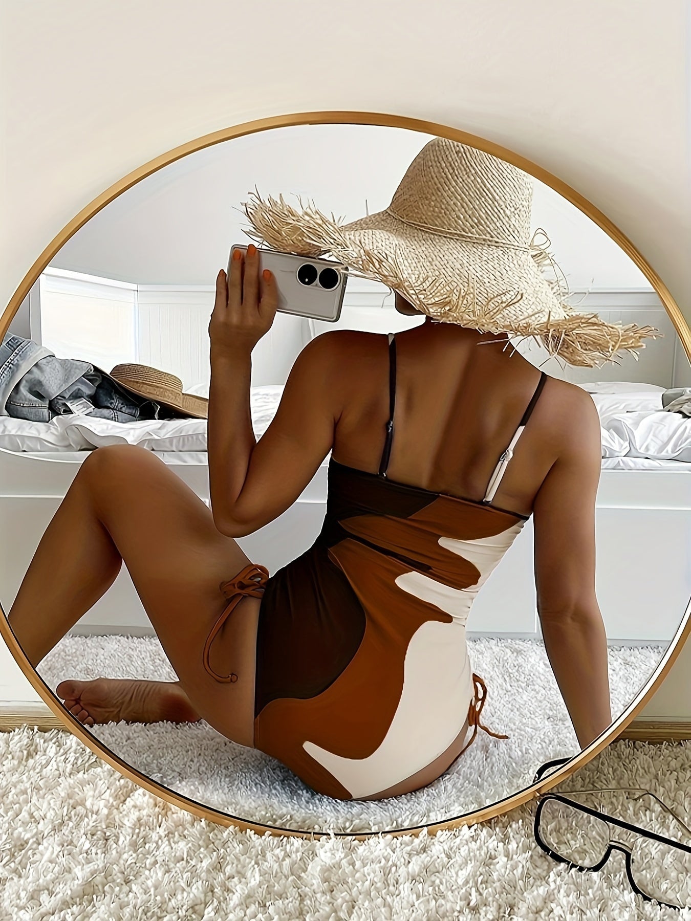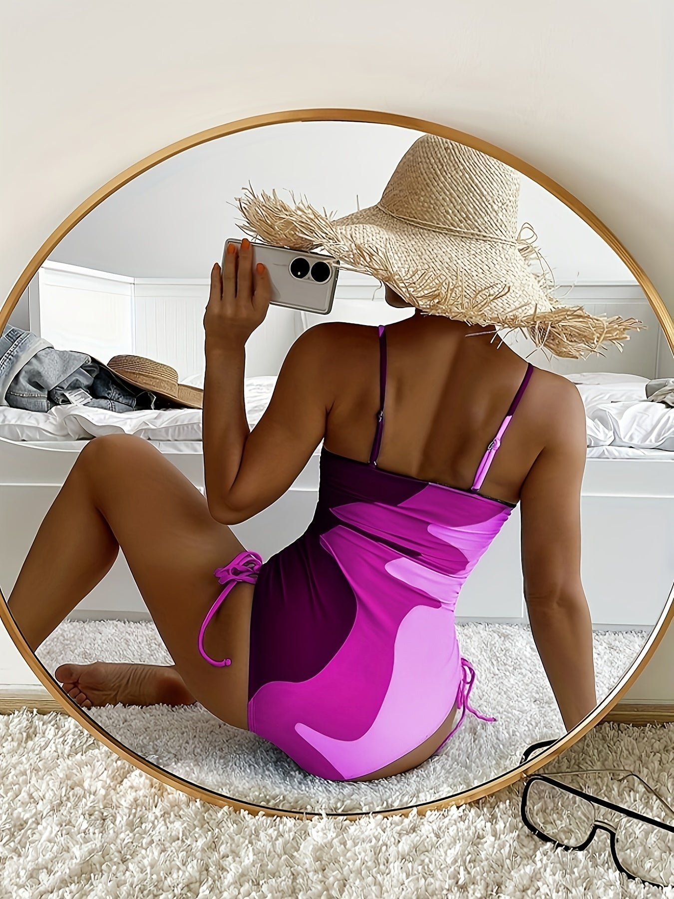 Dieser stilvolle Farbblock-Badeanzug kombiniert Eleganz mit Funktionalität. Das hochelastische Material sorgt für eine bequeme Passform und betont sanft Ihre Figur. Die Spaghettiträger bieten optimalen Halt, während der Kordelzug für eine individuelle Anpassung sorgt. Perfekt für entspannte Tage am Strand oder aktive Stunden im Wasser.