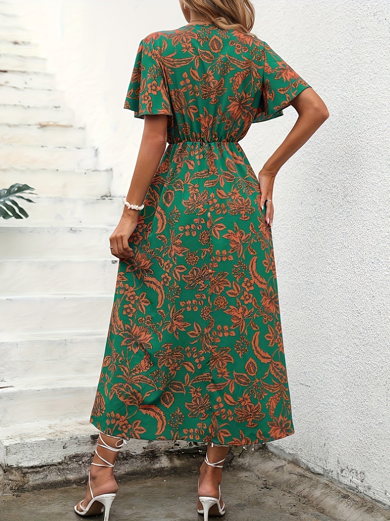 Blumenkleid Damen V-Ausschnitt A-Linie Kleid mit Schlitz & Rüschenärmeln