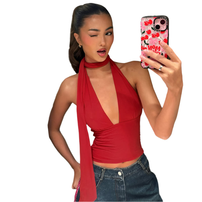 Cecily - Tiefer V-Ausschnitt Halterneck Wickeloberteil bringt eine erfrischende Balance zwischen Eleganz und modernem Touch. Mit ihrem schmeichelhaften, tiefen V-Ausschnitt und dem Halterneck-Design ist dieses ärmellose Wickeloberteil darauf ausgelegt, Ihre natürliche Silhouette zu betonen. Egal, ob Sie zum Brunch oder zu einer entspannten Abendveranstaltung gehen, der luftige Charme und die stilvolle Bindegurtschließe machen es zur idealen Wahl an warmen Tagen.