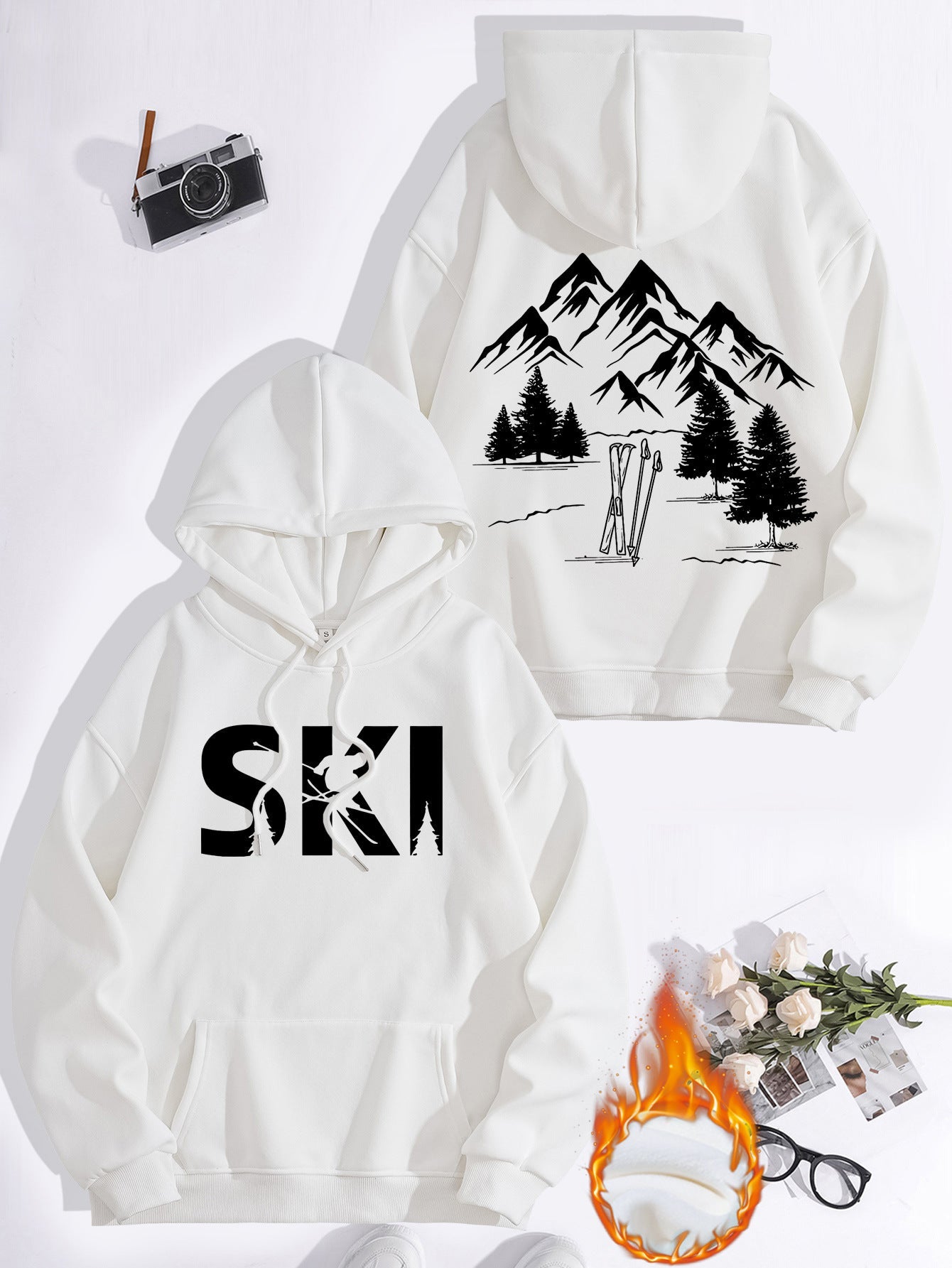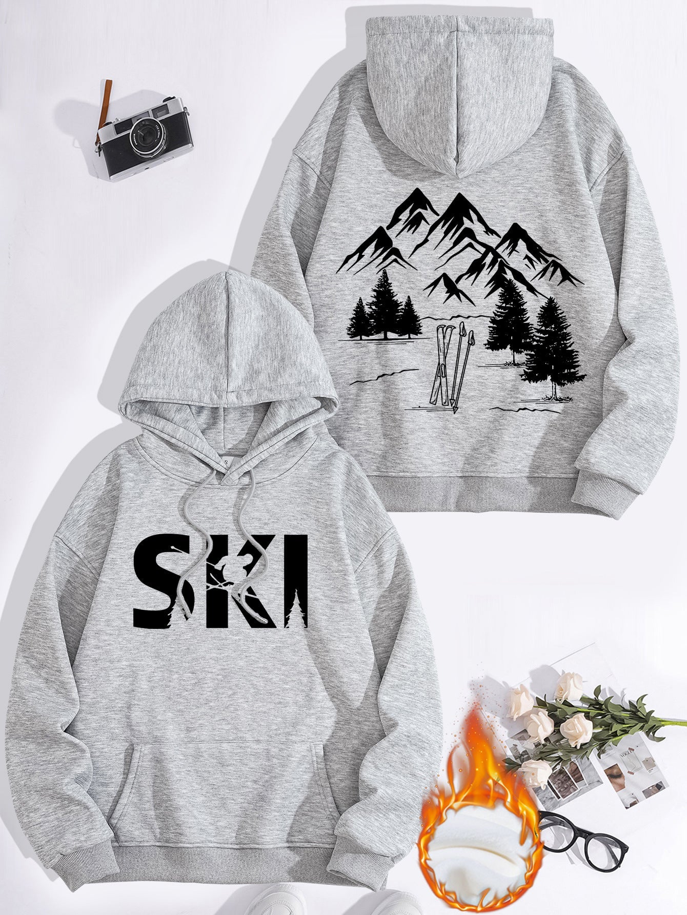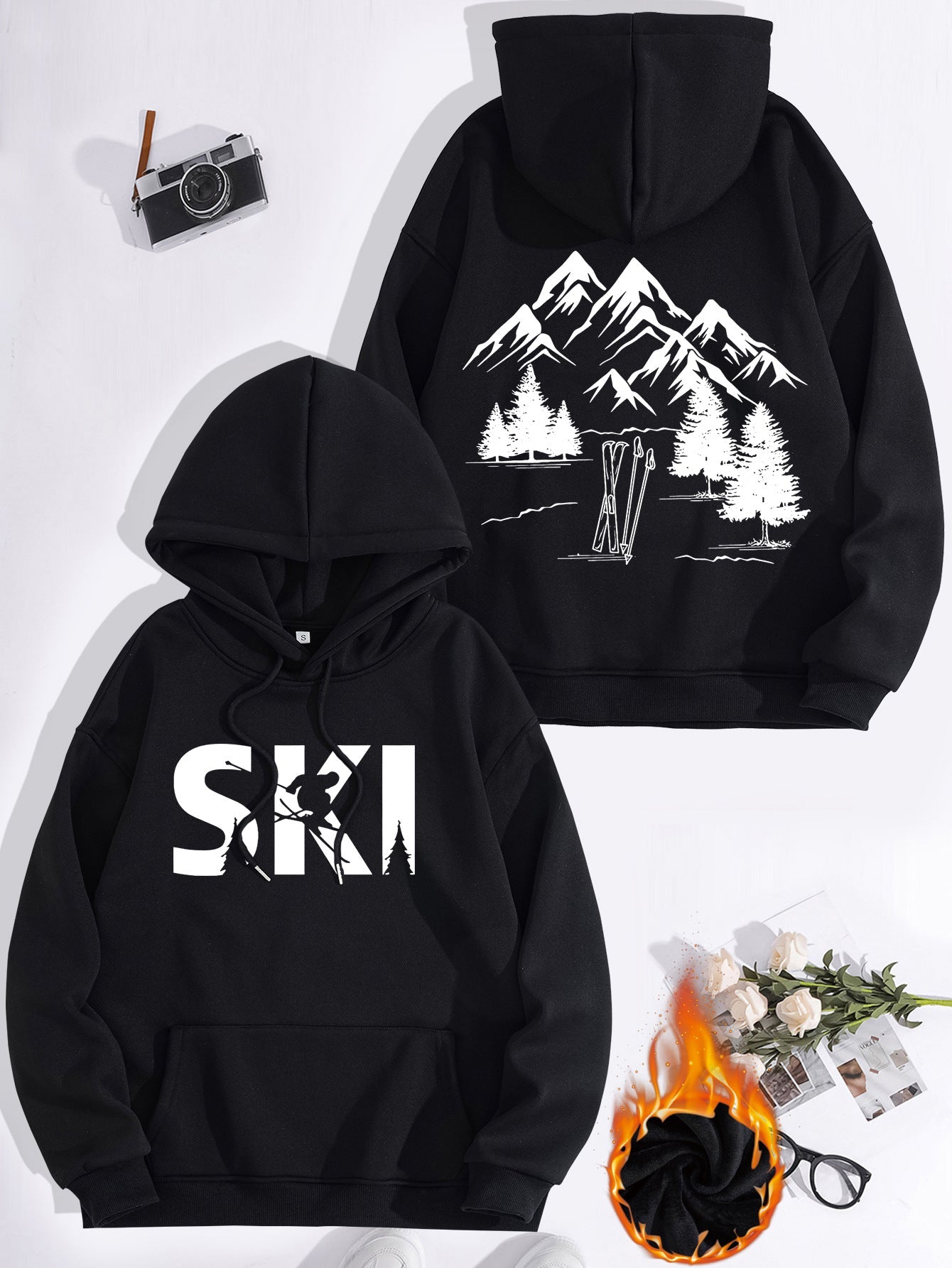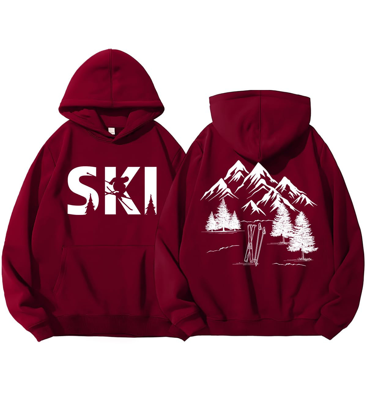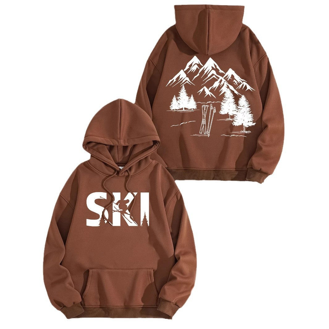 • Stylisches Design: Mit einem auffälligen Ski-Motiv und einer künstlerischen Darstellung von Bergen und Tannen, zieht dieser Hoodie alle Blicke auf sich.