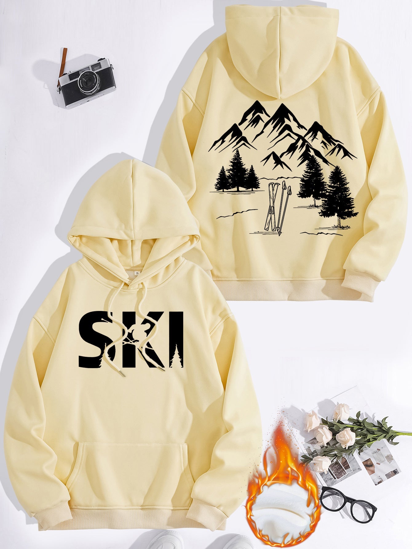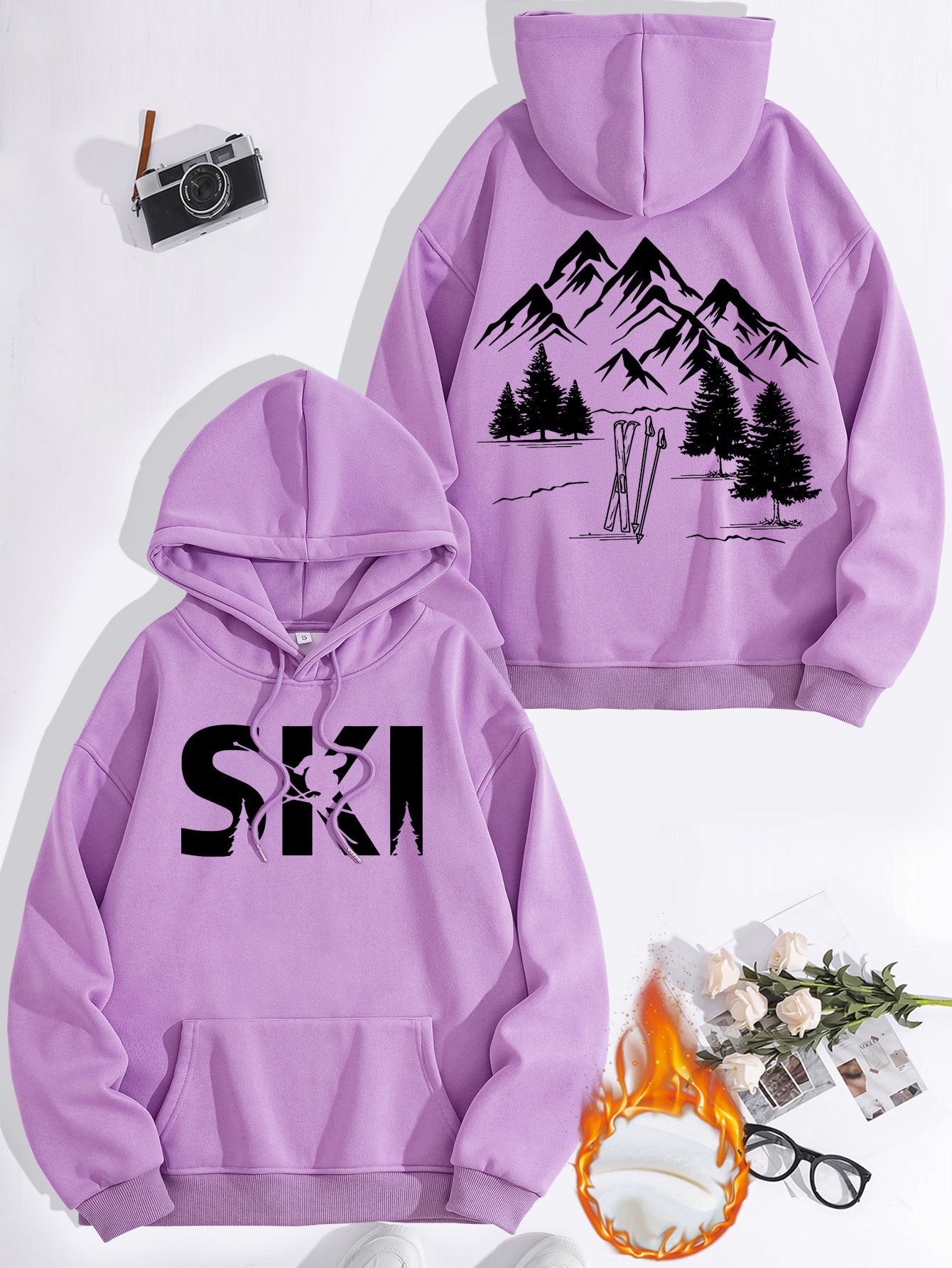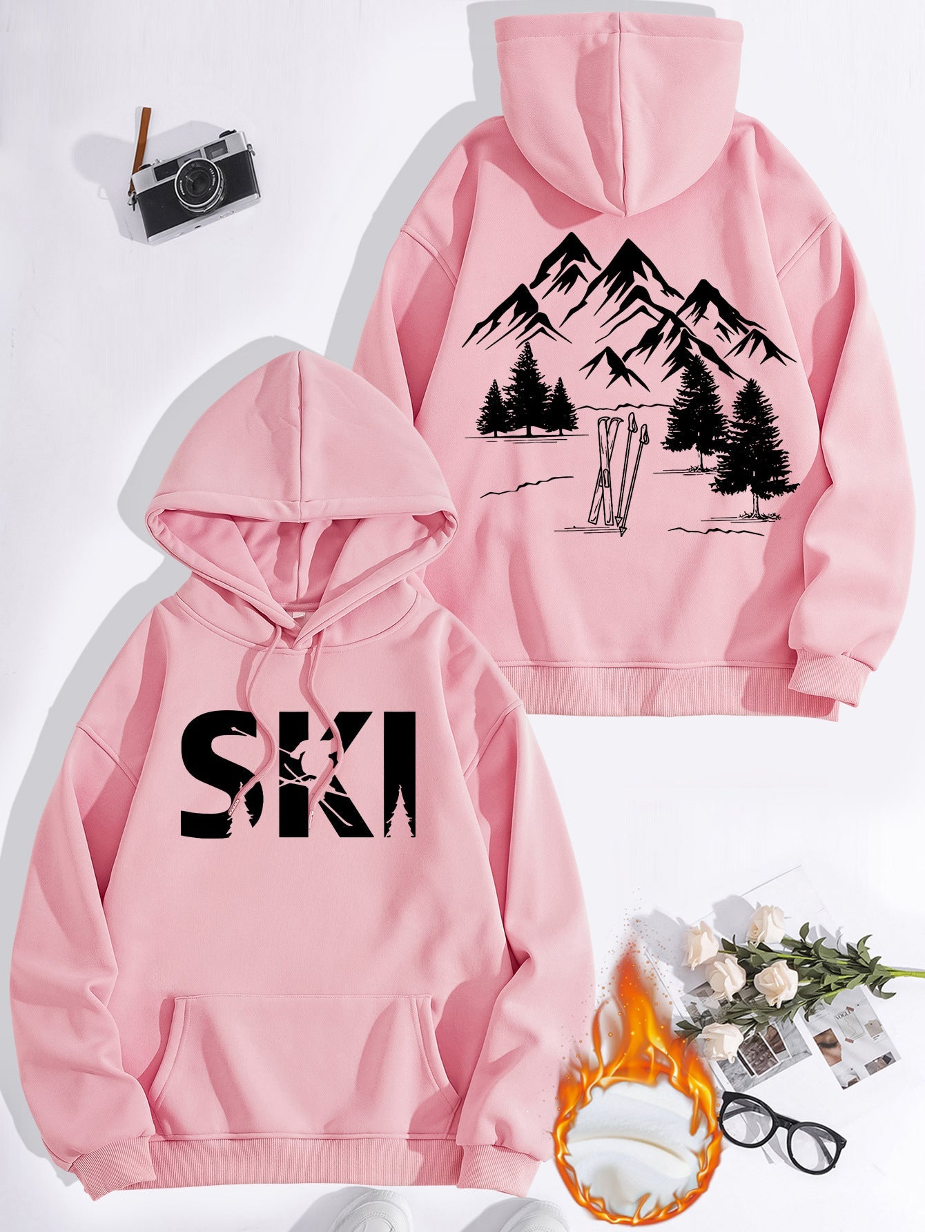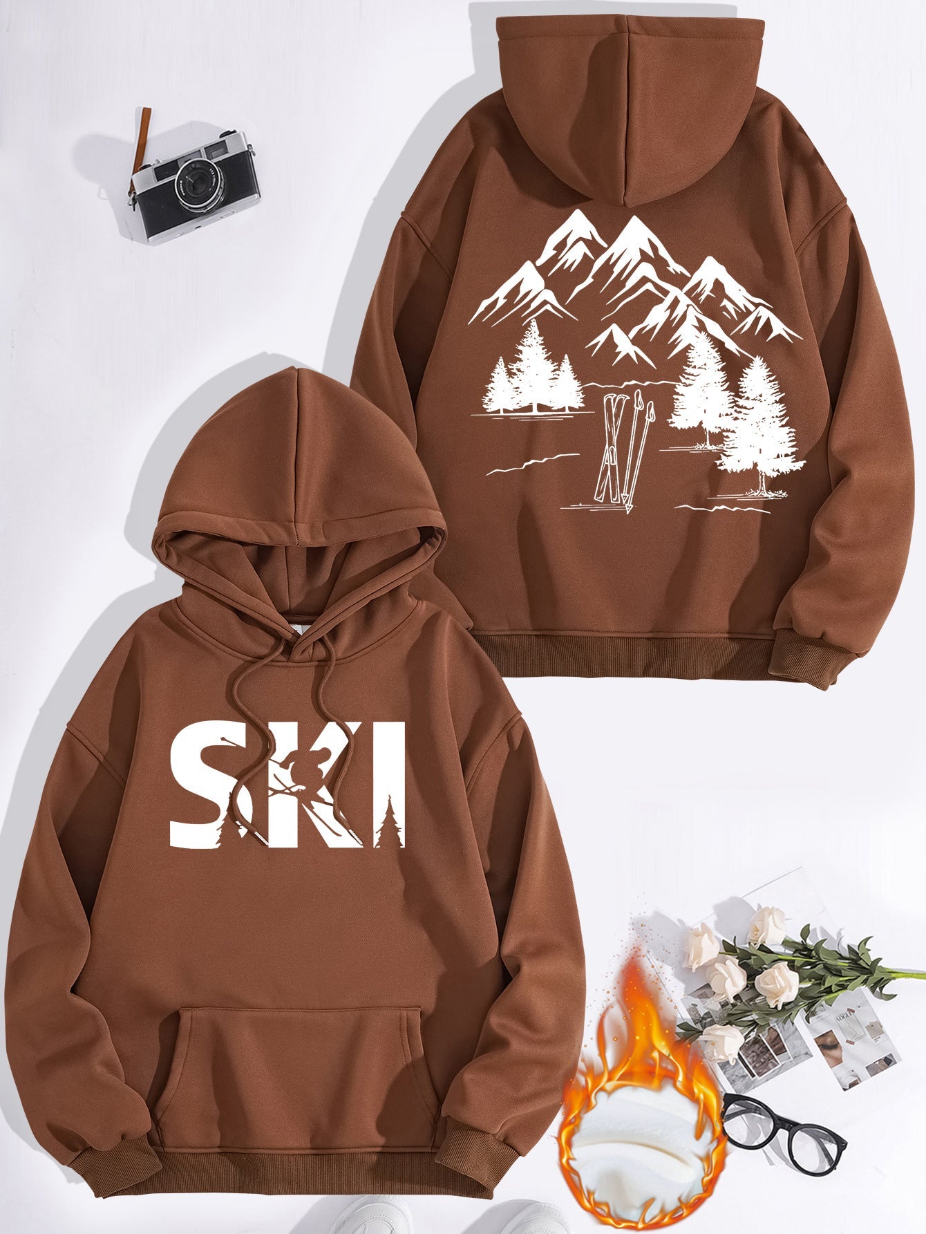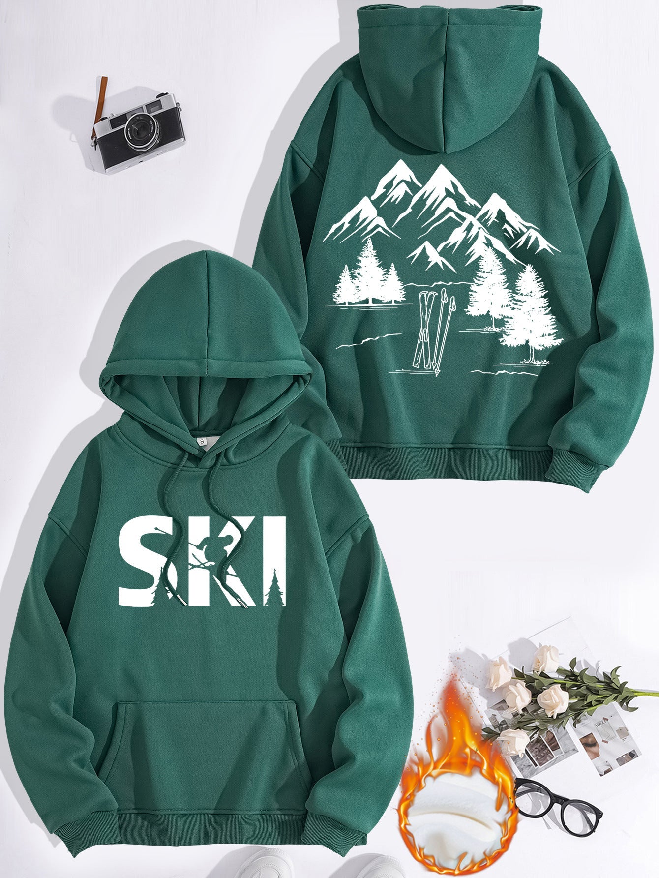 • Stylisches Design: Mit einem auffälligen Ski-Motiv und einer künstlerischen Darstellung von Bergen und Tannen, zieht dieser Hoodie alle Blicke auf sich.
