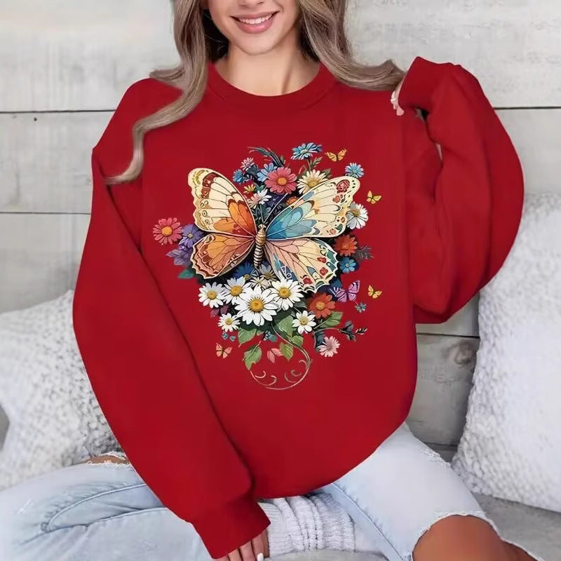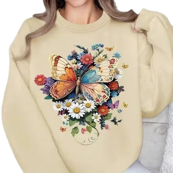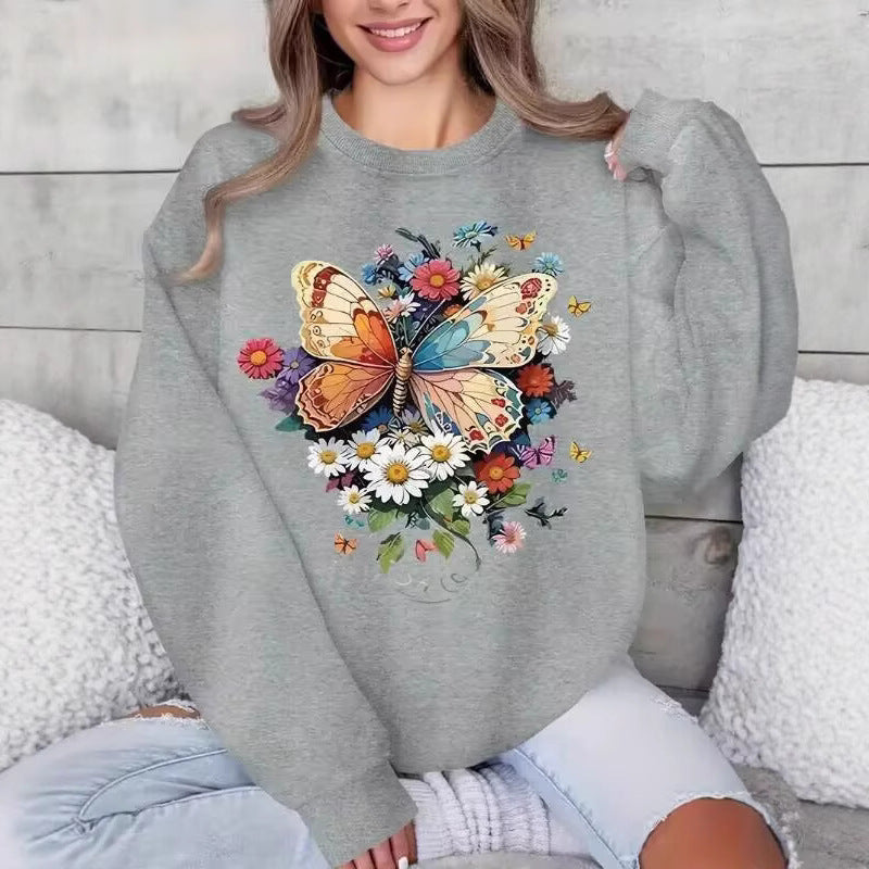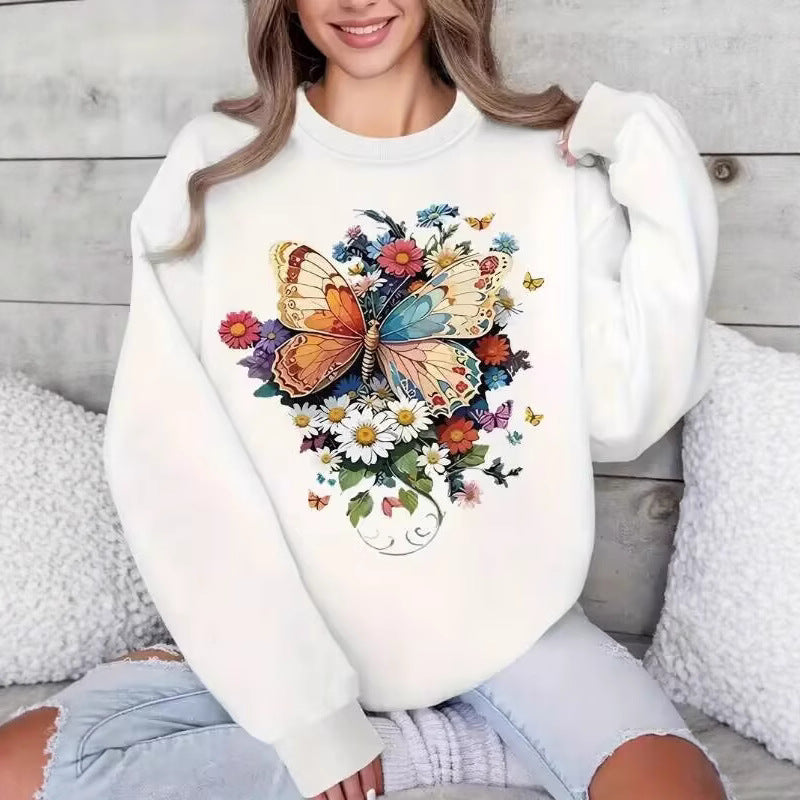 • Designer-Aufdruck: Der auffällige florale Schmetterlingsdruck verleiht dem Sweatshirt einen lebendigen und einzigartigen Look, der Blicke auf sich zieht.