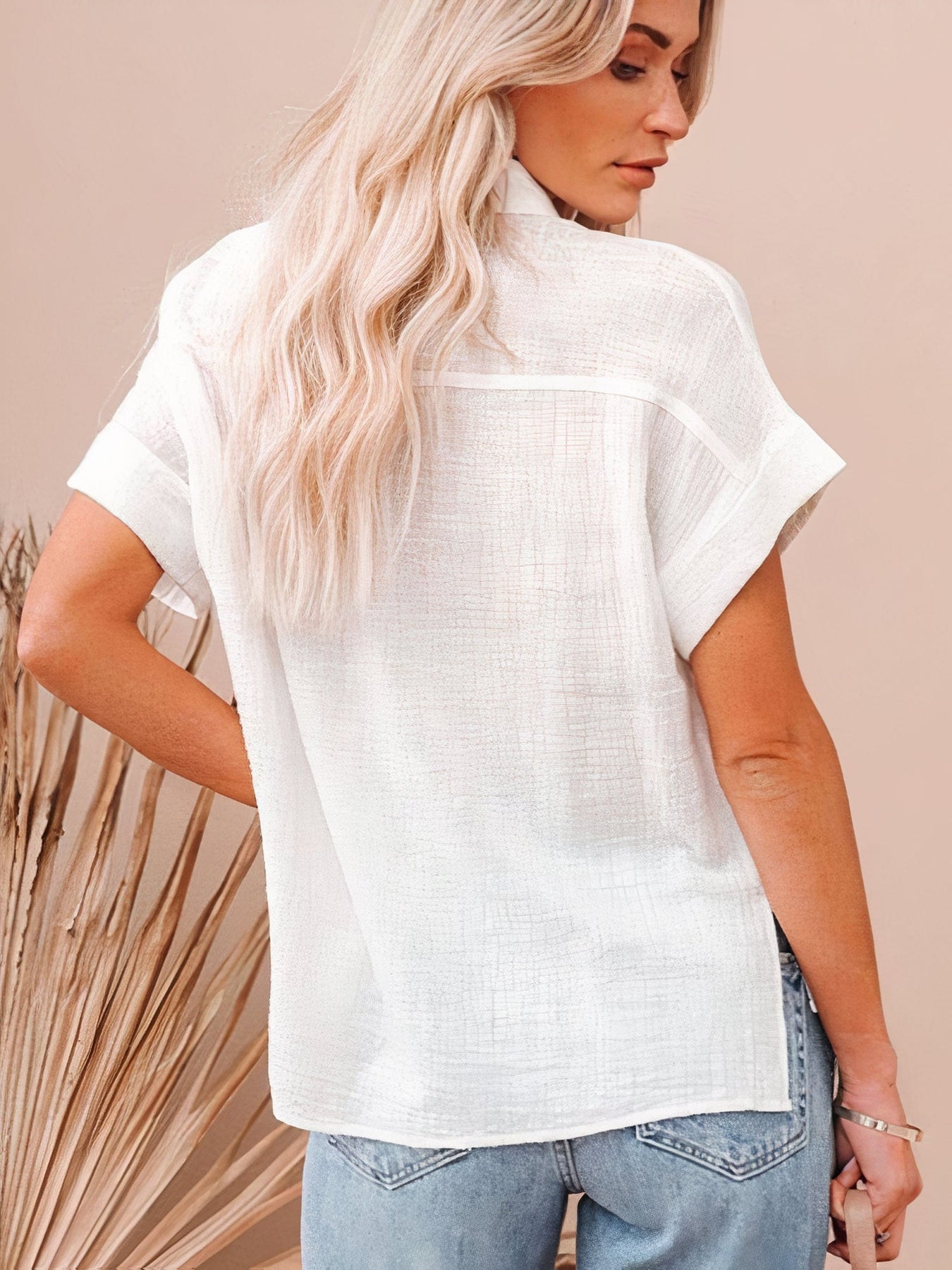 Diese Sommerbluse für Damen ist aus weichem Stoff gefertigt und verfügt über kurze Ärmel, einen Kragen und einen Knopfverschluss vorne. Diese leichte Bluse für warmes Wetter ist mit einer einzigen Brusttasche ausgestattet. Sie eignet sich für den täglichen Gebrauch bei heißen Temperaturen und bietet sommerliche Eigenschaften für eine Vielzahl von Situationen.