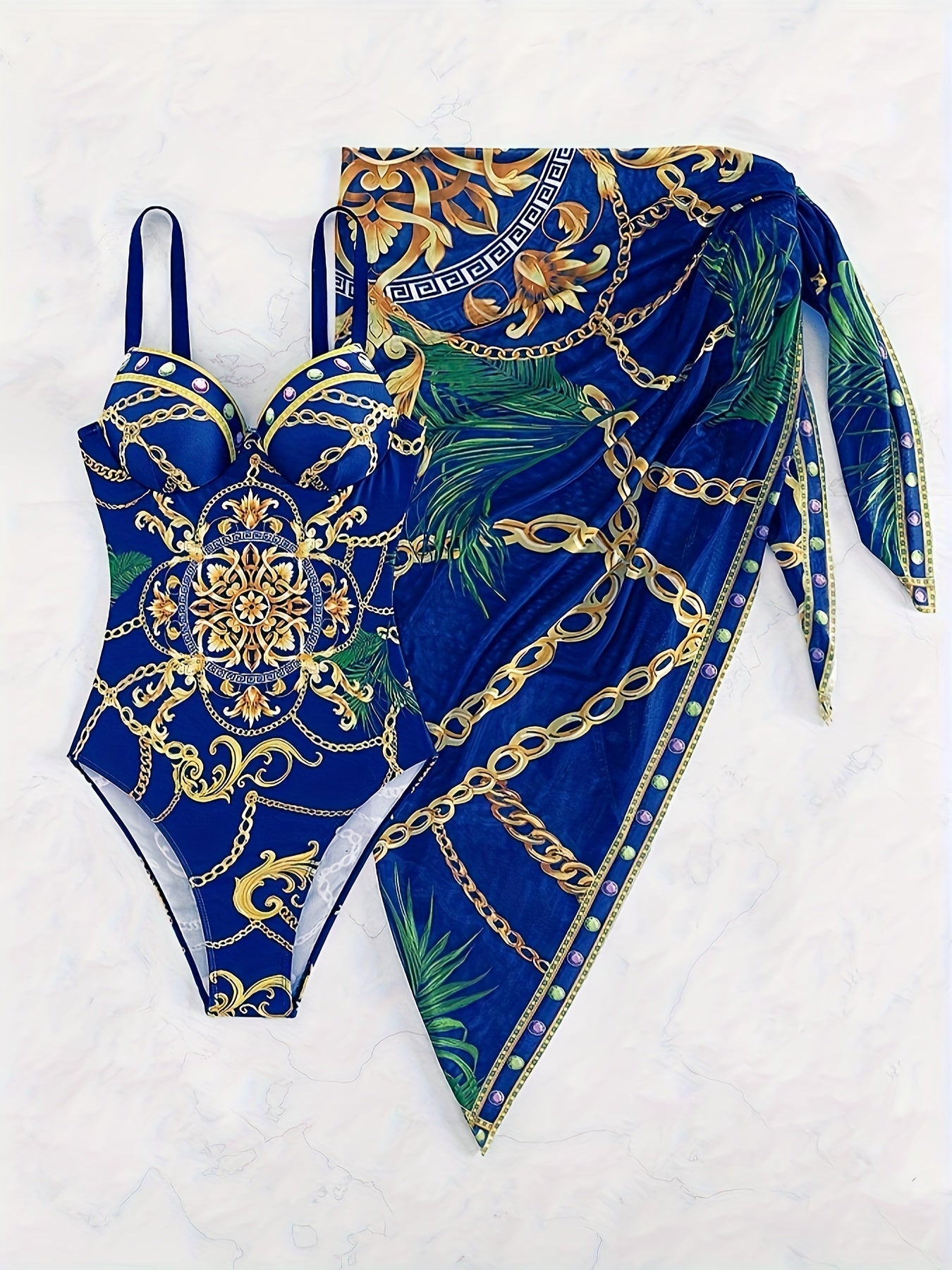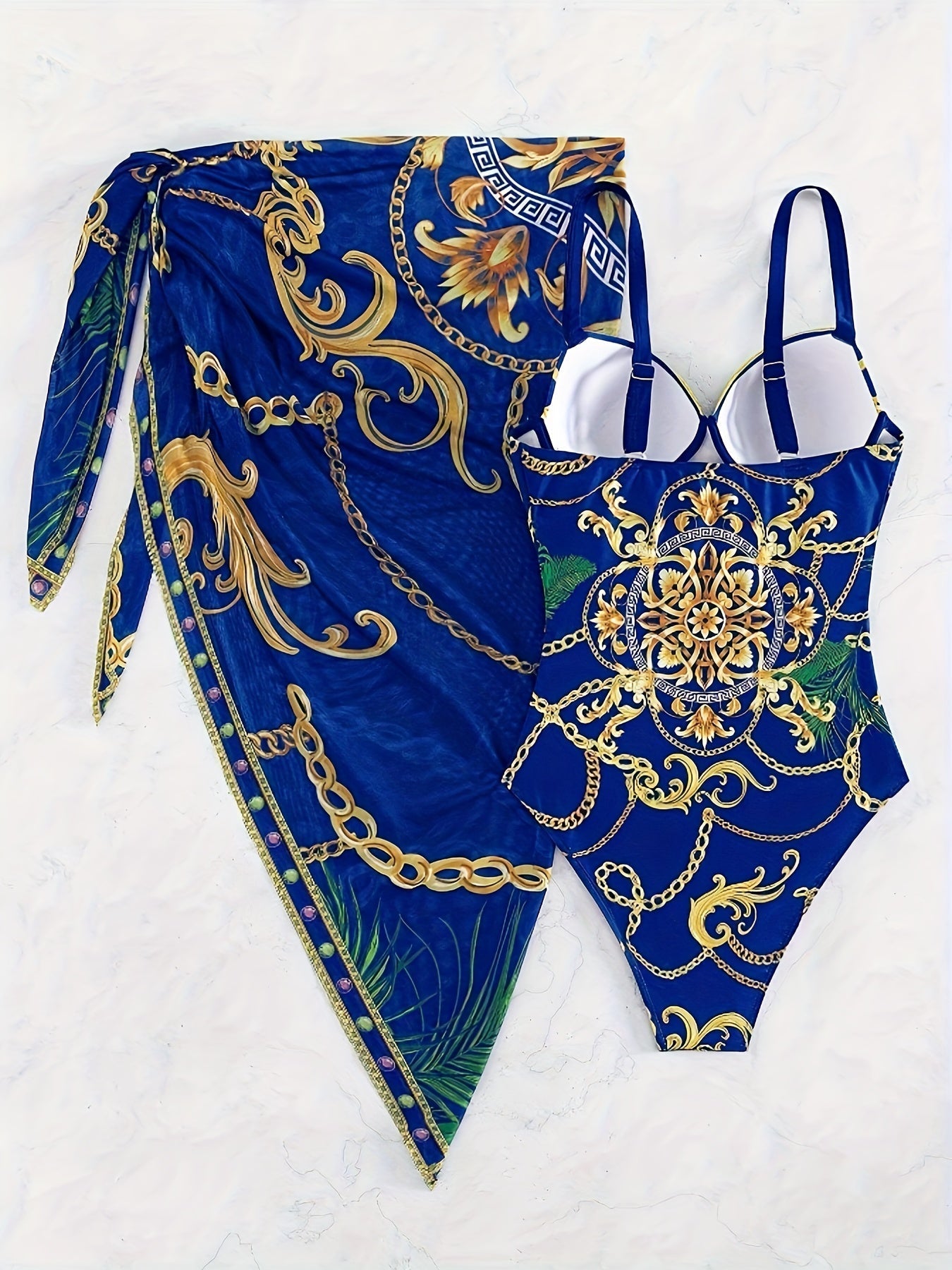 Eleganter 2-teiliger Badeanzug mit Kettenmuster – V-Ausschnitt, Push-Up, Spaghettiträger