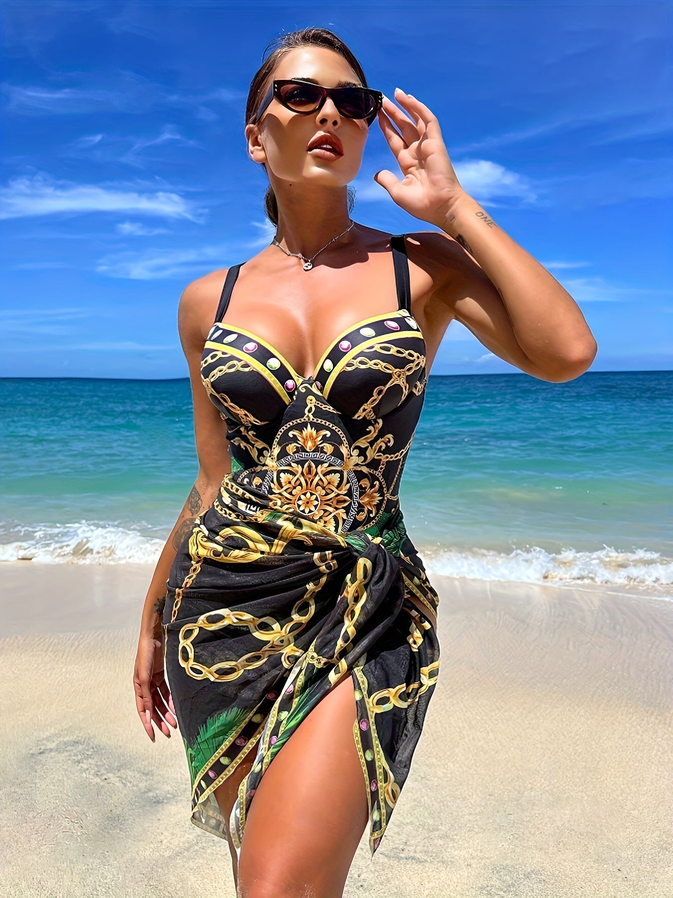 Dieser stilvolle zweiteilige Badeanzug kombiniert Eleganz und Komfort und ist ideal für sonnige Tage am Strand oder am Pool. Das edle Kettenmuster verleiht dem Design eine luxuriöse Note, während der V-Ausschnitt und die Push-Up-Funktion für eine schmeichelhafte Silhouette sorgen. Die schmalen Spaghettiträger sind verstellbar und bieten optimalen Halt.