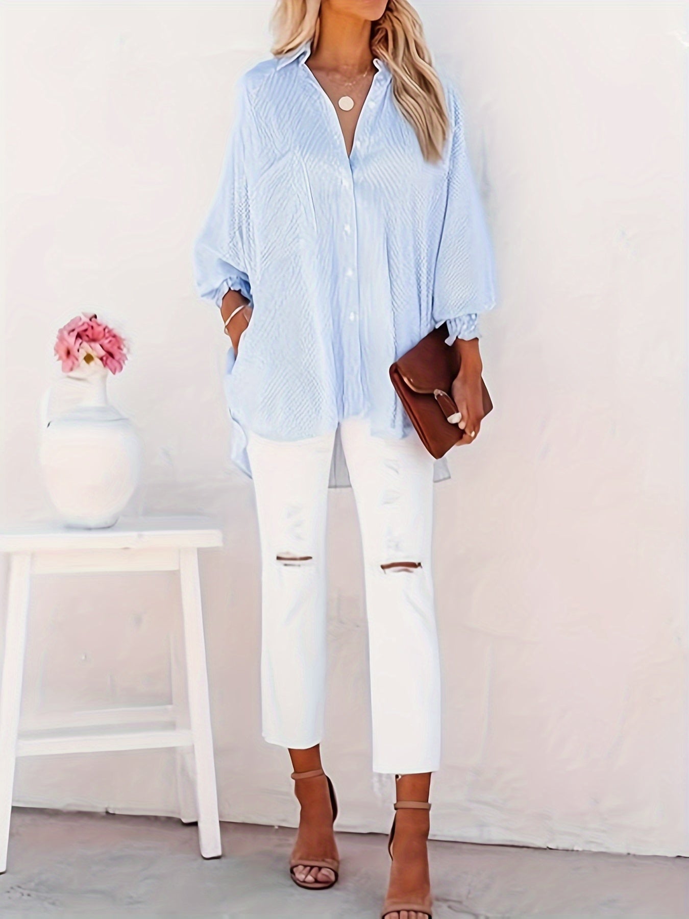 Dieses stilvolle Damenhemd vereint klassische Eleganz mit modernem Design. Das dezente Streifenmuster verleiht einen zeitlosen Look, während die plissierten Manschetten und die praktische Brusttasche raffinierte Details hinzufügen. Der leichte, atmungsaktive Stoff sorgt für hohen Tragekomfort, perfekt für Büro, Freizeit oder besondere Anlässe. Die lockere Passform und die langen Ärmel machen es ideal für vielseitige Stylings – lässig oder schick. Erhältlich in einer klassischen Farbe.