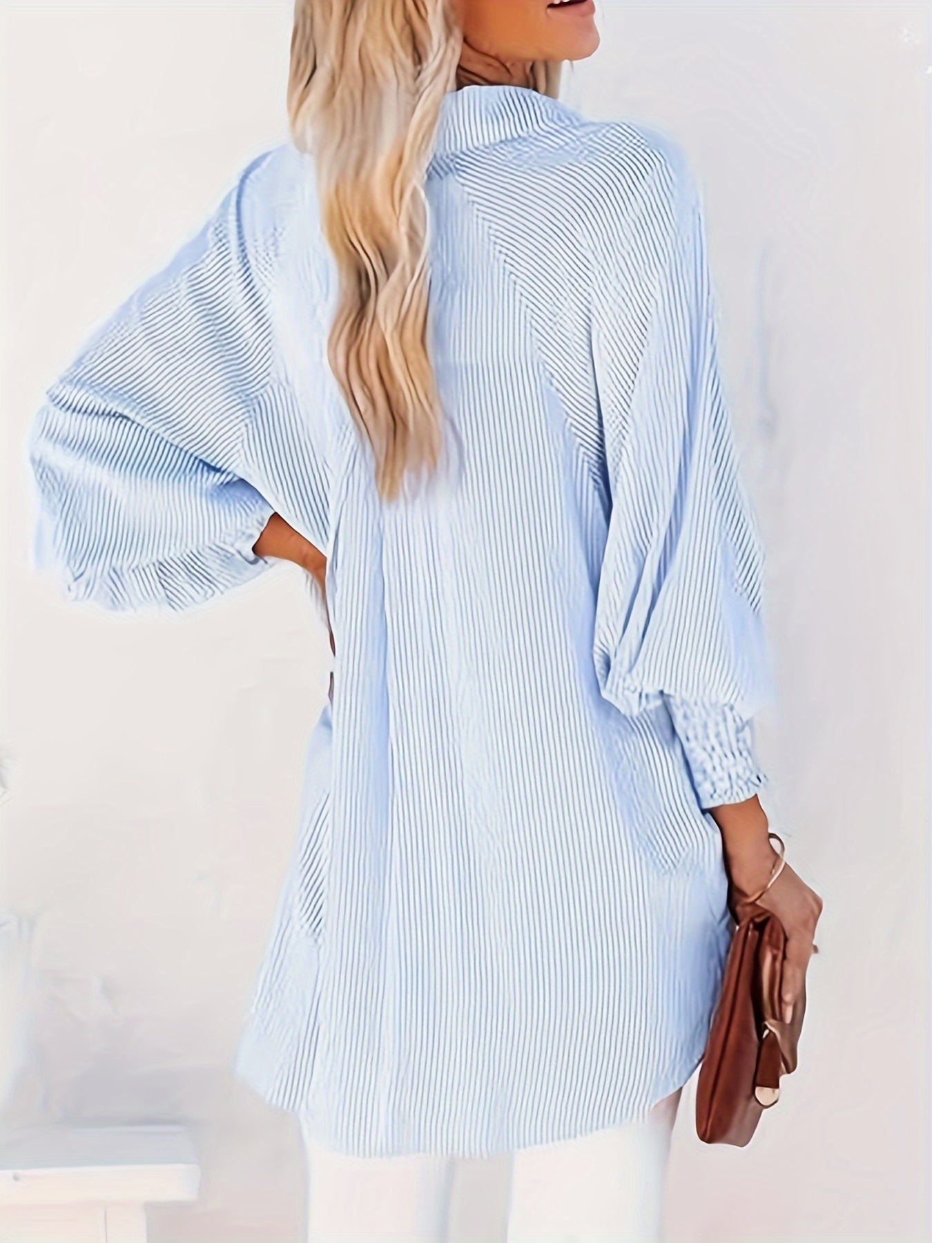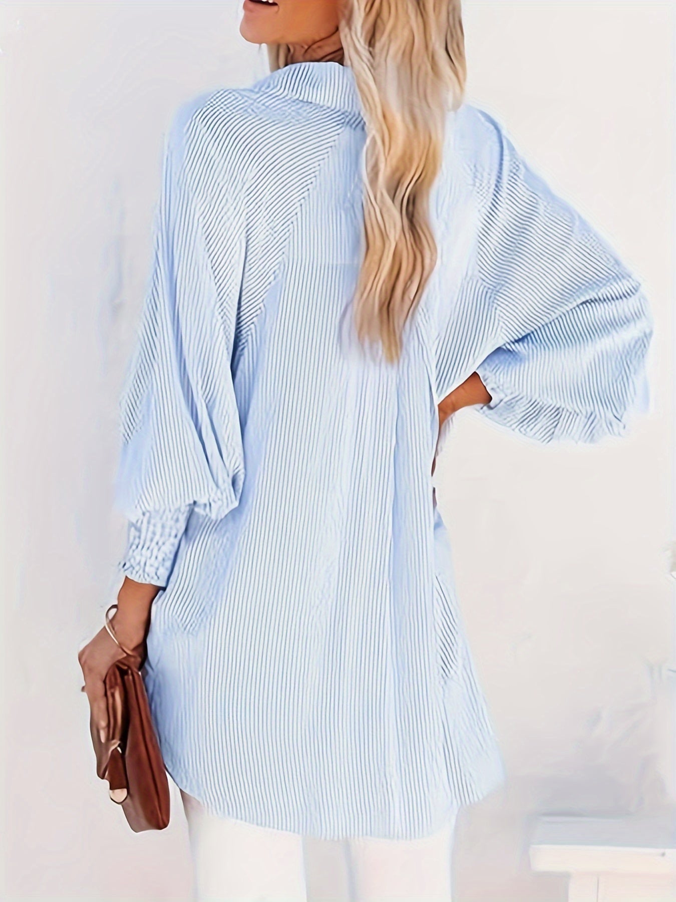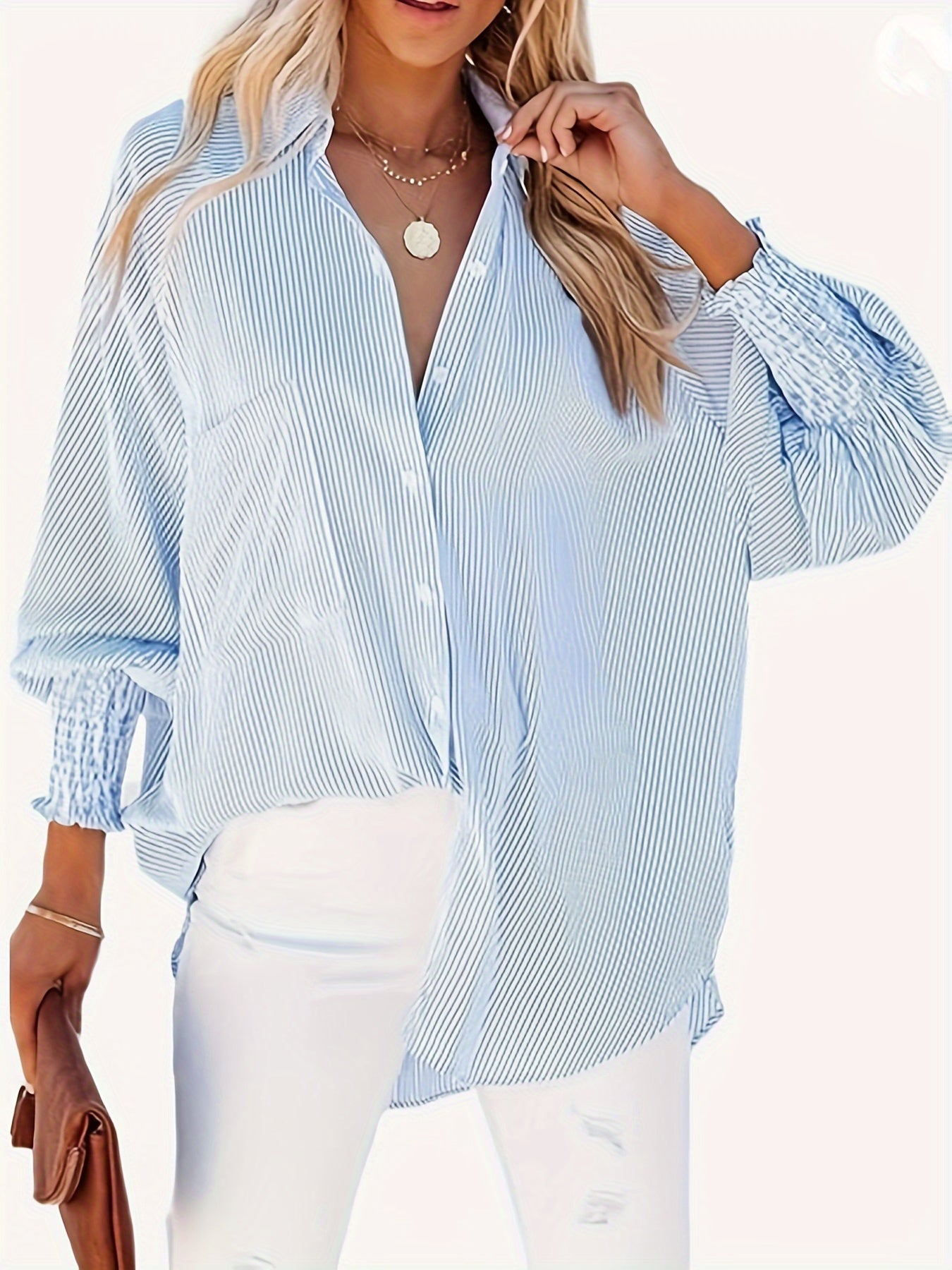 Elegantes Damenhemd – Gestreift, Langarm, Brusttasche & Plissierte Manschetten
