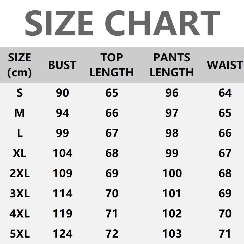 | Größe | Brustumfang | Oberteillänge | Hosenlänge | Taillenumfang |