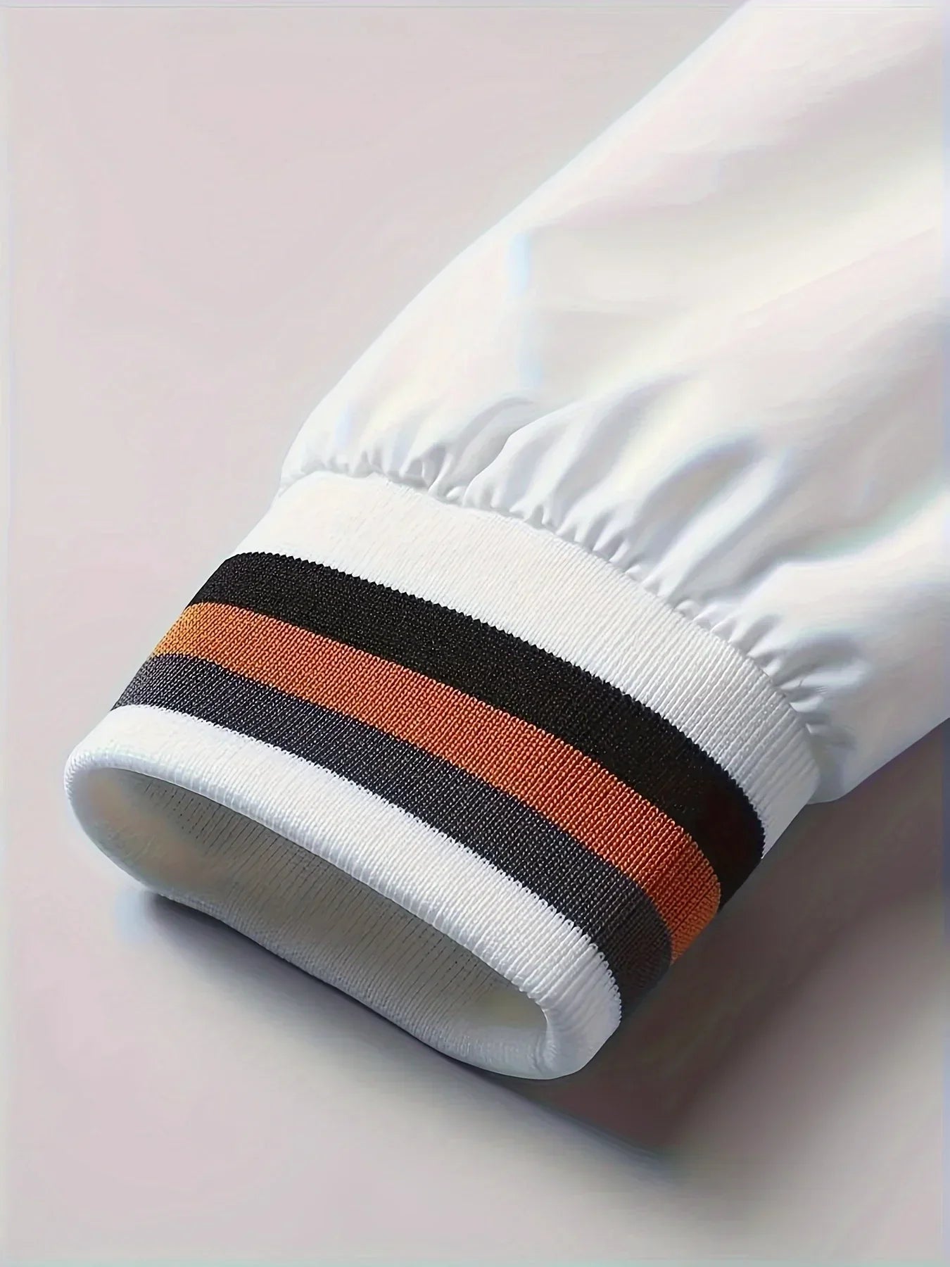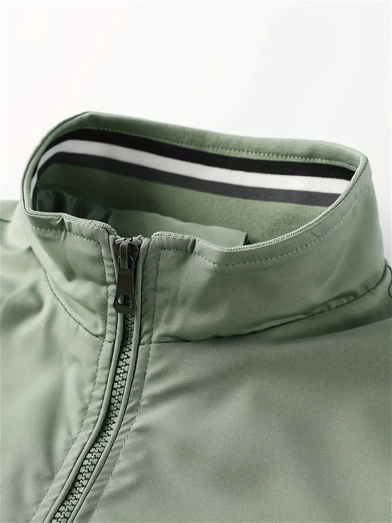 Diese Herren Bomberjacke verfügt über lange Ärmel, einen Reißverschluss und eine kontrastierende Farbverarbeitung an Kragen und Bündchen. Sie ist für die kühleren Monate des Herbstes und Frühlings entworfen und bietet eine funktionale Option zum Lagenlook.