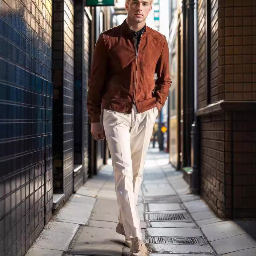 Entdecken Sie die exklusive Herren elegante Wildleder-Bikerjacke von Aliams, die modernen Style und zeitloses Design vereint.