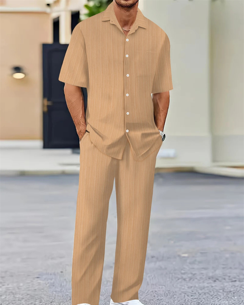 Dieser stylische Zweiteiler für Herren besteht aus einem klassischen Kurzarm-Hemd mit Knopfleiste und einer locker geschnittenen Hose – ideal für entspannte Tage, Reisen oder sommerliche Freizeitlooks. Komfort und Stil vereint in einem Set.