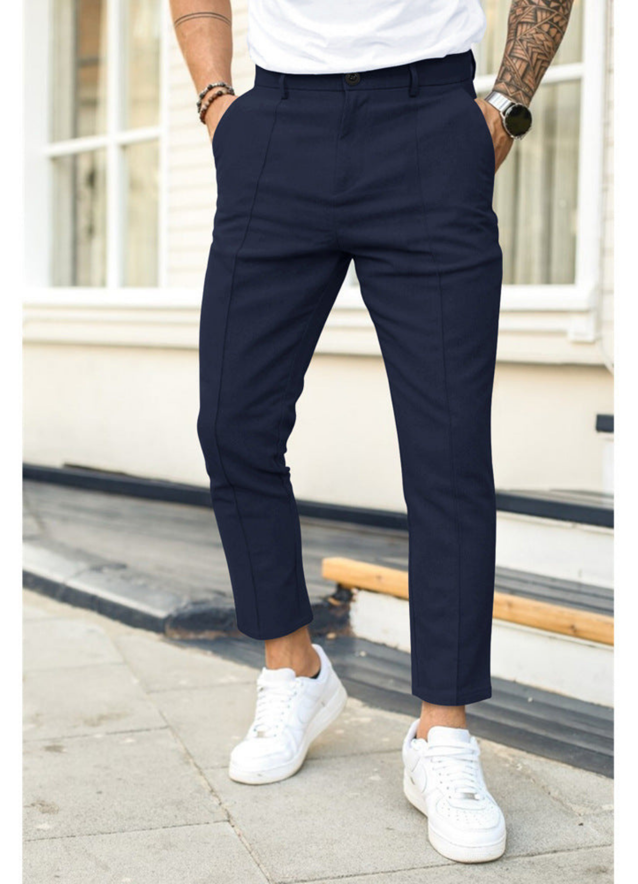 Diese Herrenhose ist knöchellang und hat ein leicht schmal zulaufendes Bein. Sie verfügt über Fronttaschen, sichtbare Nähte und Bügelfalten. Das Design ist geradlinig und passt zu verschiedenen Anlässen.