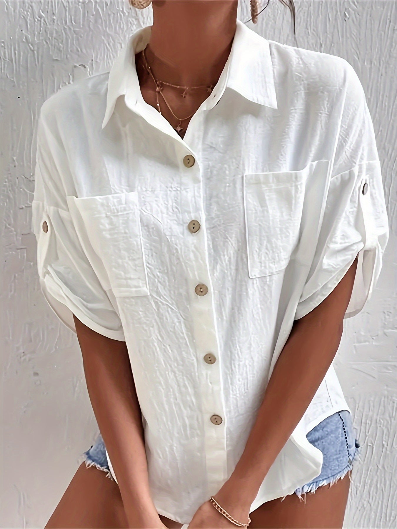 Lässig Kurzarm Leinen-Bluse für Damen Knopfleiste