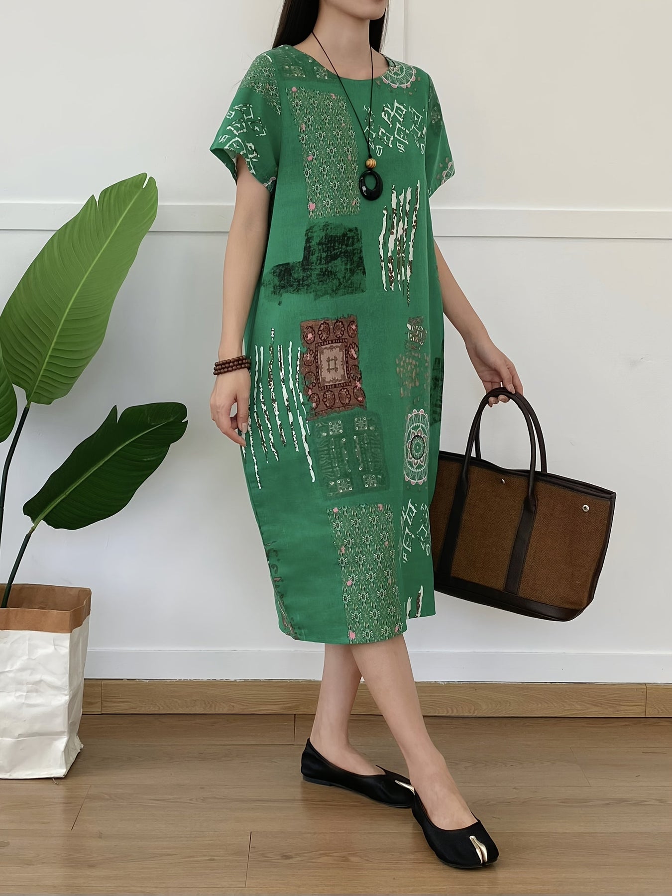 Leinen-Tunika-Kleid für Damen – Rundhalsausschnitt, Blumenprint, Taschen & Lässig