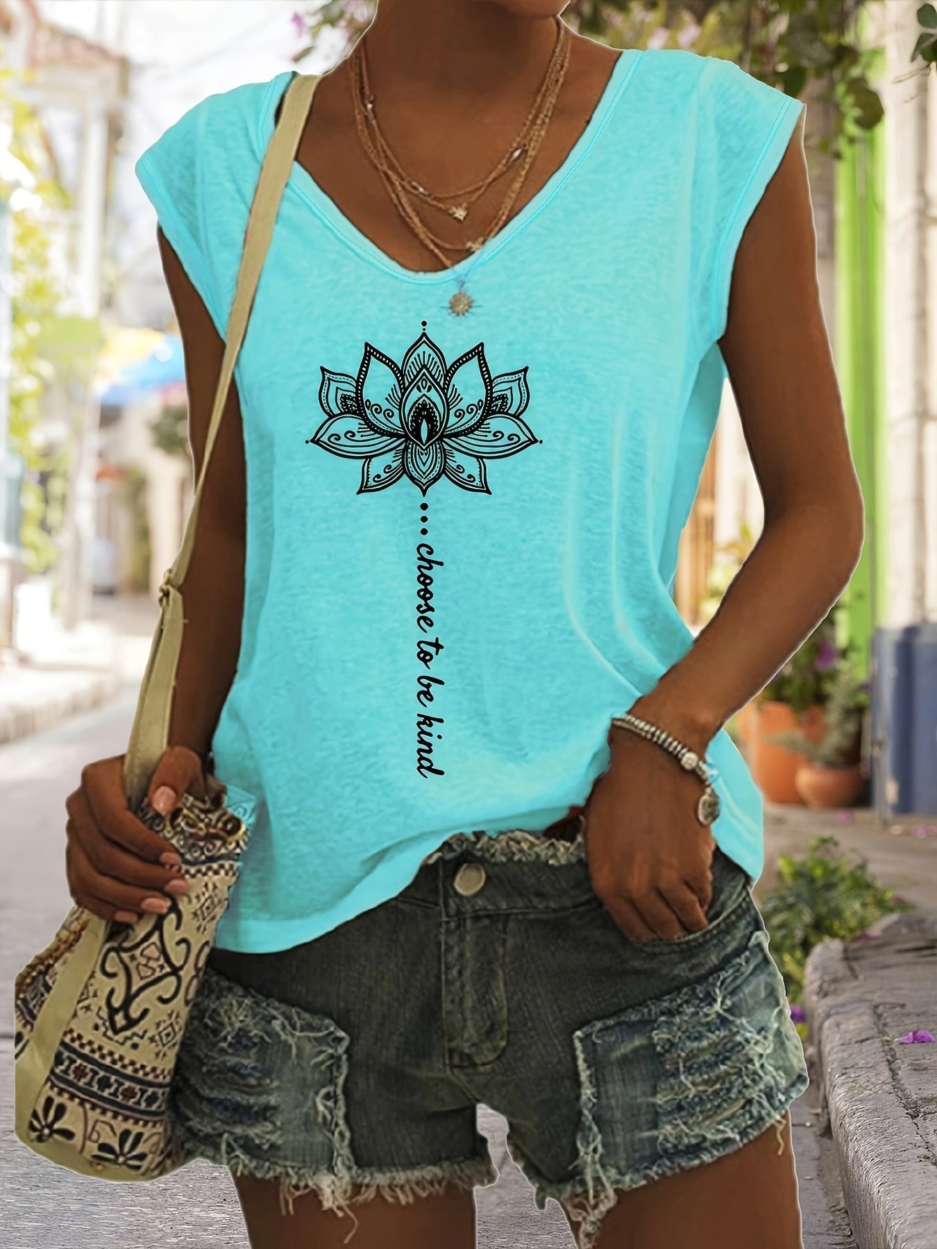 Lotus Print V-Neck Top – Cap Sleeve Casual Sommerbluse für Frauen