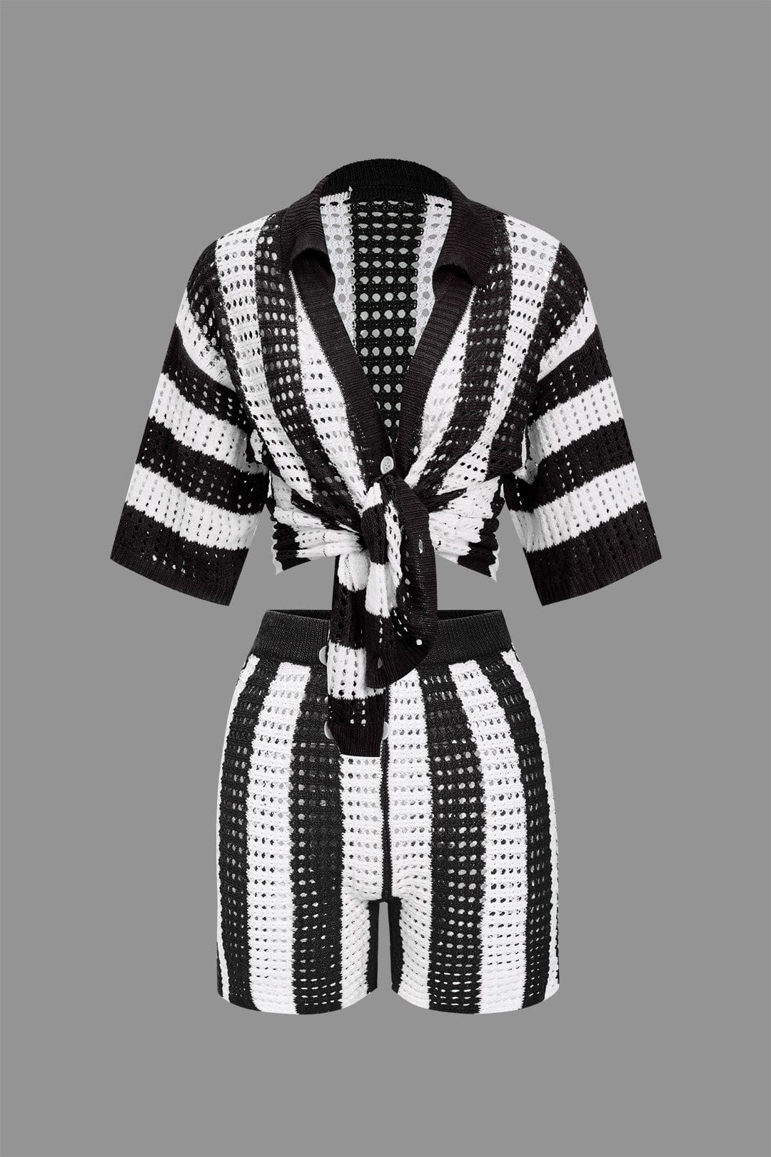 Das Noemi Zweiteiler-Set kombiniert verspielte Eleganz mit lässigem Boho-Charme. Das gehäkelte Material mit trendigem Streifenmuster sorgt für eine luftige und leichte Passform – perfekt für sommerliche Tage, Strandspaziergänge oder Festivals. Das geknotete Oberteil verleiht dem Look eine raffinierte Note, während die passenden Shorts für einen bequemen Sitz und maximale Bewegungsfreiheit sorgen.