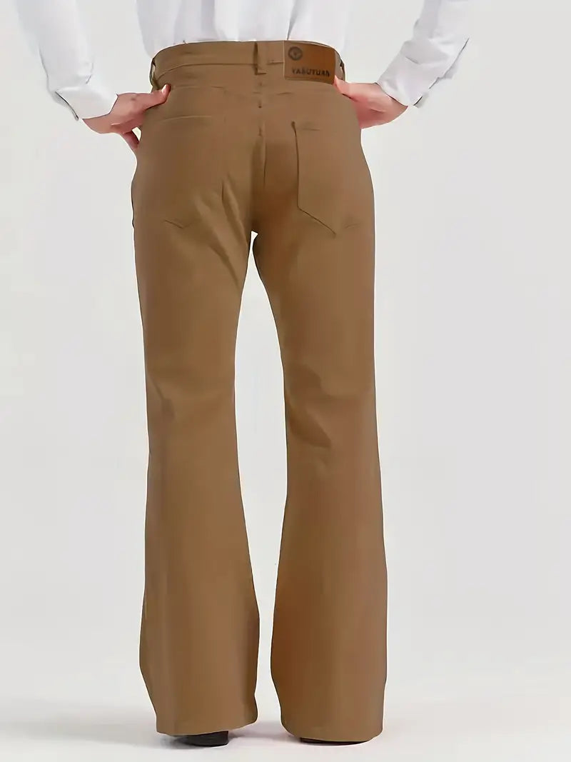 - Klassischer Schlaghosenschnitt: Ganz im Stil der 60er und 70er Jahre haben diese Jeans ausgestellte Beine, die knapp unter dem Knie beginnen und sich allmählich zum Knöchel hin weiten, wodurch eine dramatische Glockenform entsteht. Dieser Retro-Stil ist nicht nur ein Hingucker, sondern auch bequem und schmeichelhaft und verleiht Ihnen eine einzigartige Silhouette, die auffällt.