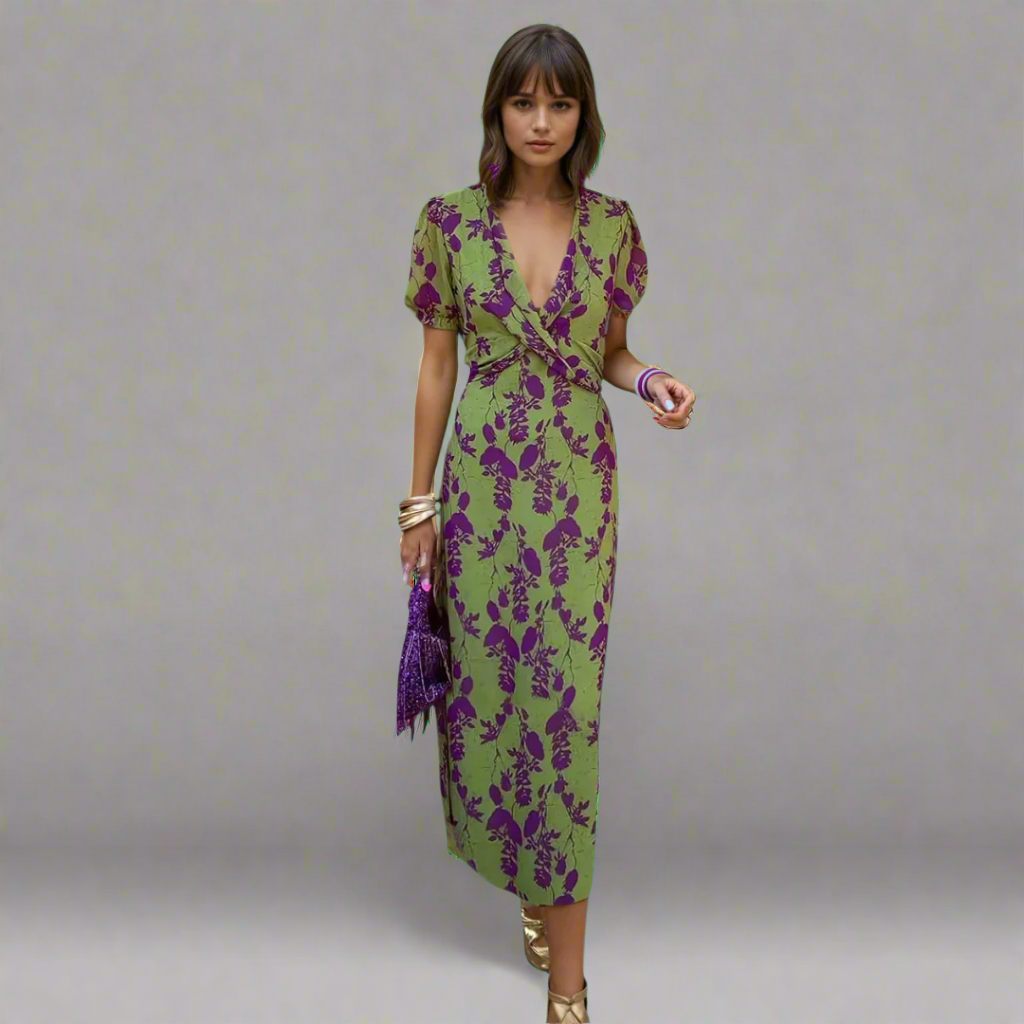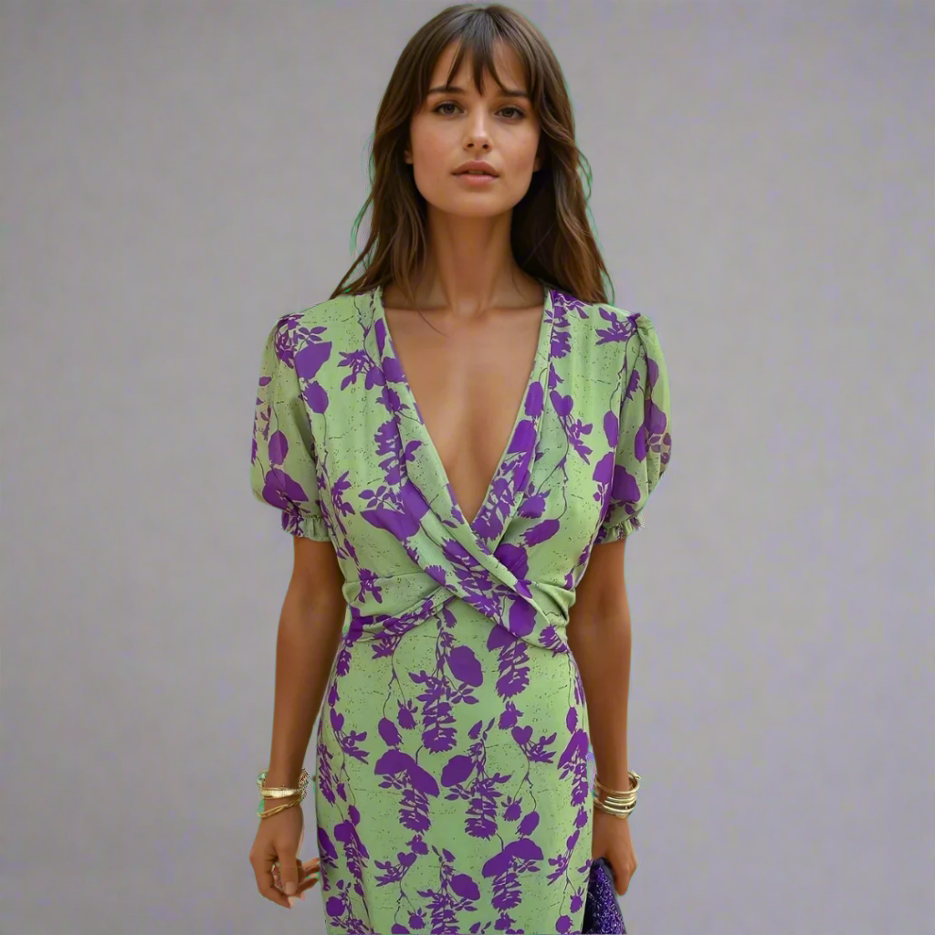 Verleihen Sie Ihrem Look mit unserem Zalherlind Wickelkleid in Grün & Lila eine elegante Note. Es ist die perfekte Wahl für jede Frau, die stilvolle Mode mit Komfort verbinden möchte. Leichte, atmungsaktive Stoffe sorgen für Wohlbefinden an warmen Sommertagen und bieten zugleich eine schmeichelhafte Passform, die jede Silhouette betont. Ideal für Hochzeiten, Abendessen oder entspannte Sommerausflüge – dieses Kleid lässt Sie in jeder Situation bezaubernd aussehen.