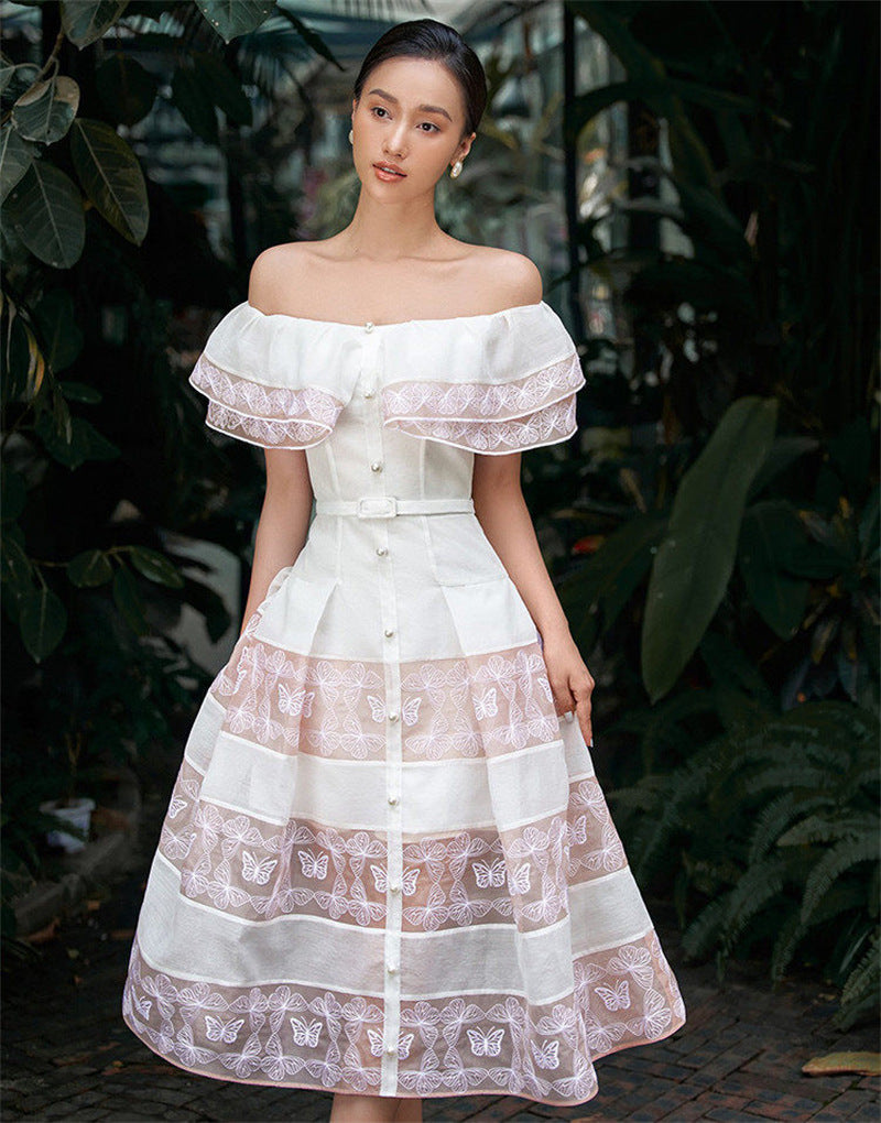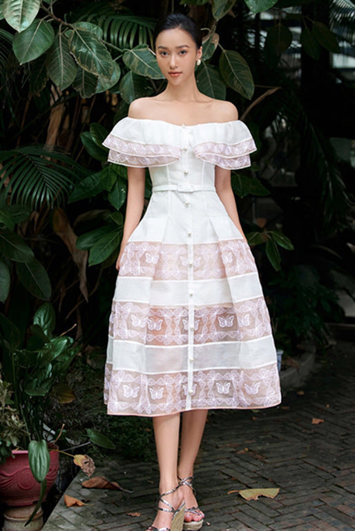 - 1x Amalia : Weißes einteiliges Kleid mit hoher Taille, tailliert und fließend