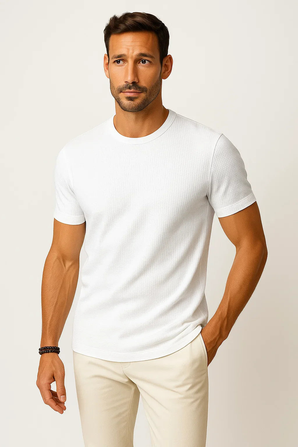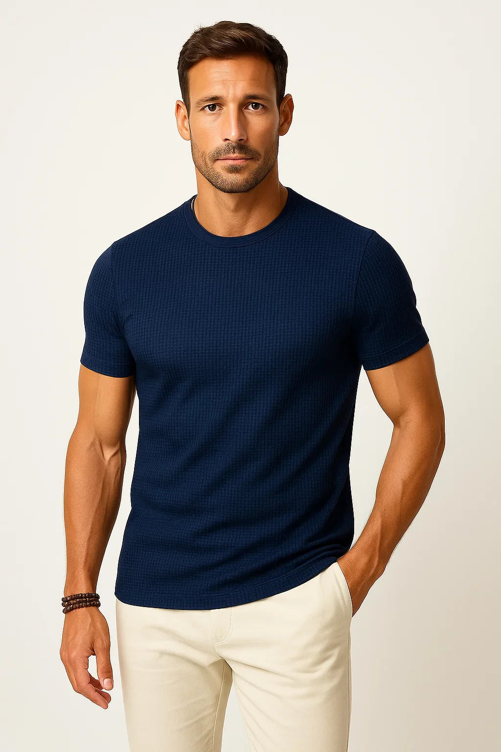 Das Lars Waffelstruktur T-Shirt kombiniert modernes Design mit sportlicher Lässigkeit und sorgt für einen stilvollen Auftritt in jeder Gelegenheit. Mit seinem dezenten Waffelmuster und körperbetonten Schnitt passt es perfekt zu deinem aktiven Lifestyle. Der elastische Stoff sorgt für eine angenehme Passform und hohen Tragekomfort, während die atmungsaktive Materialstruktur für Wohlfühltemperaturen sorgt.