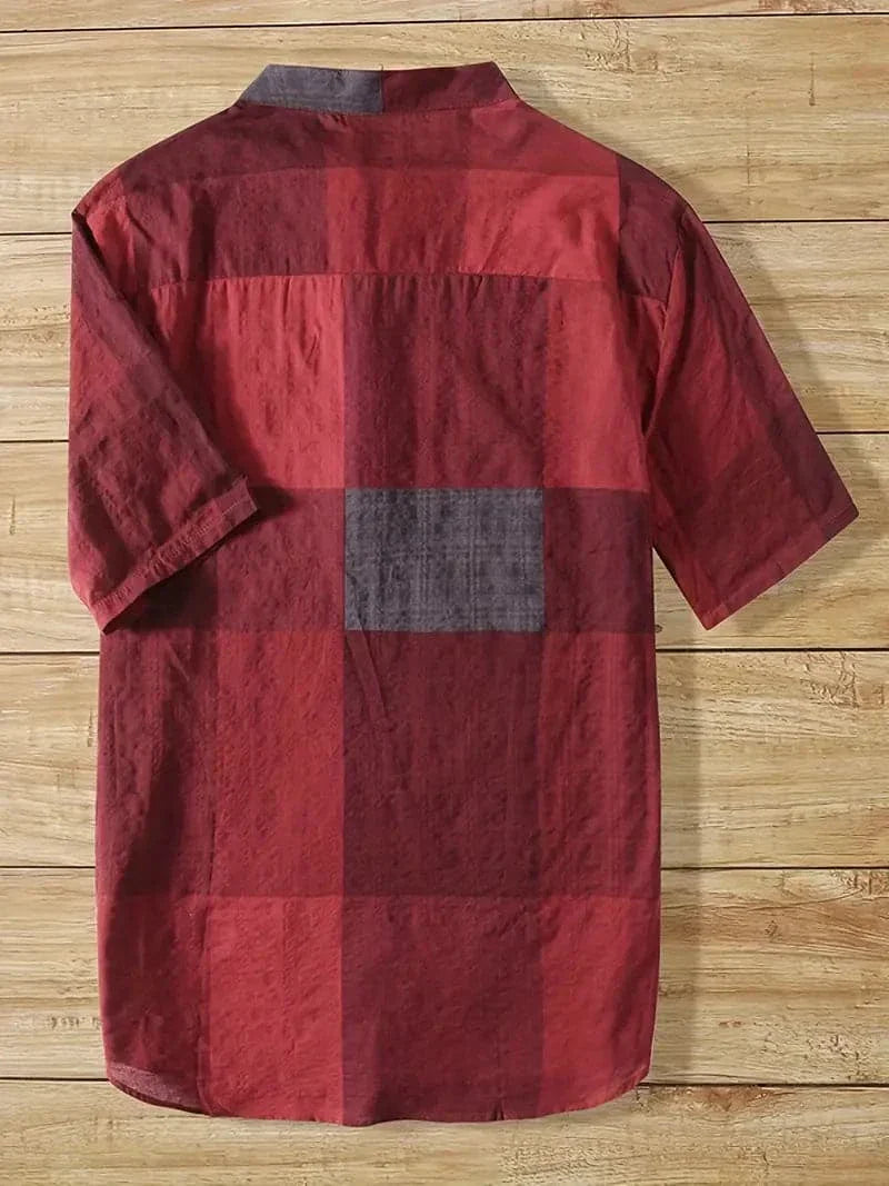 Verleihen Sie Ihrer Garderobe mit dem Herrenhemd mit Stehkragen und Karomuster einen modernen Touch. Dieses Hemd kombiniert die markante Eleganz eines Karomusters mit der modernen Note eines Stehkragens und bietet einen klaren, eleganten Look, der in jeder Umgebung hervorsticht. Das Karomuster verleiht Tiefe und Charakter, während der Stehkragen für ein einzigartiges und edles Finish sorgt.