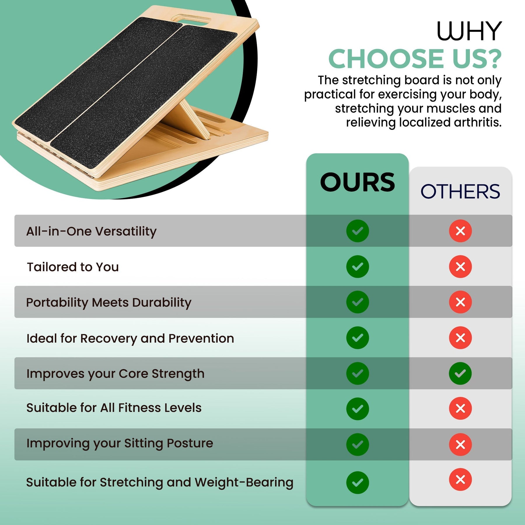 Erleben Sie die Freiheit schmerzfreier Bewegung – mit diesem Brett und einfachen täglichen Übungen. Ideal zur Vorbeugung und Genesung bei häufigen Verletzungen wie Plantarfasziitis und Schienbeinschmerzen, damit Sie Ihr Leben wieder genießen können.