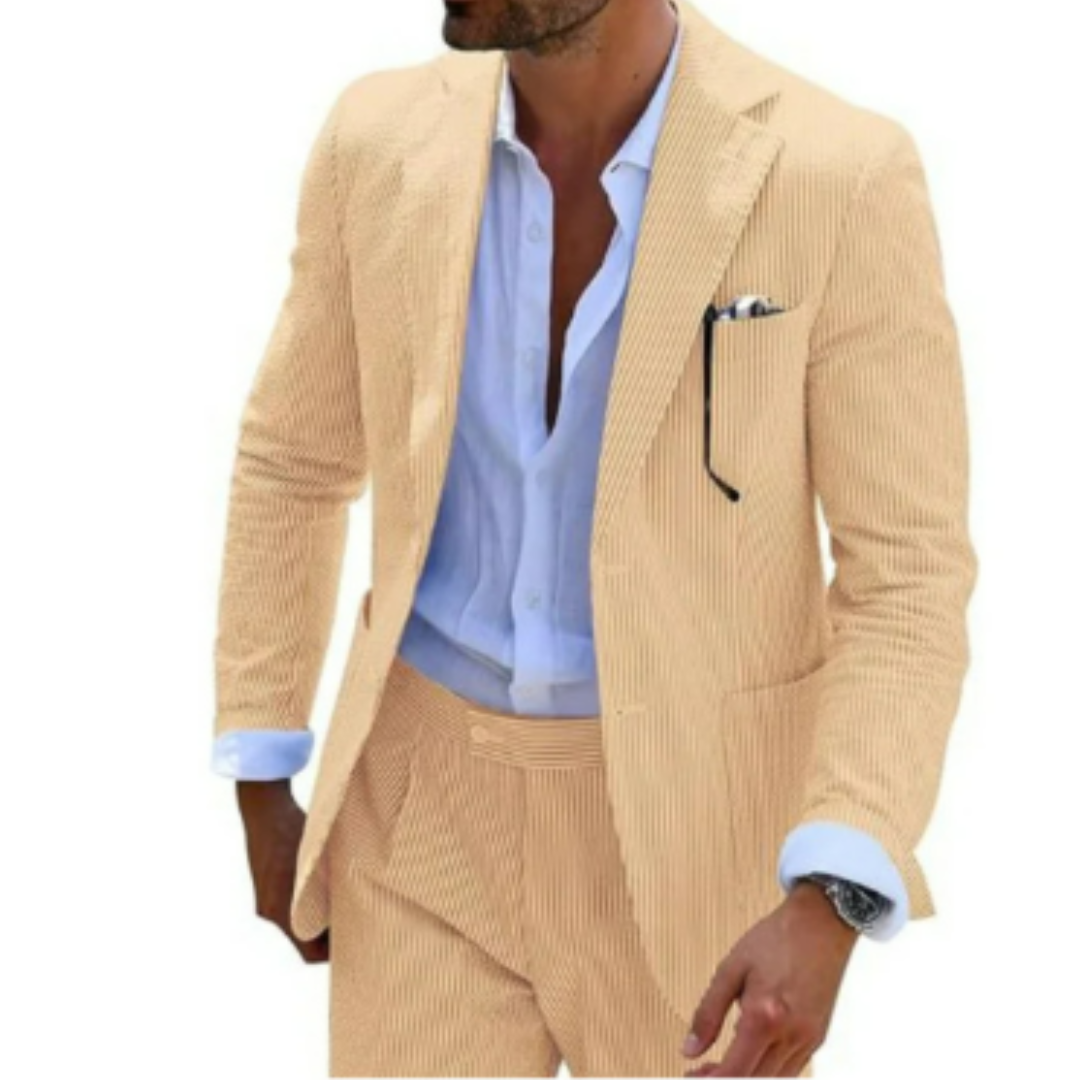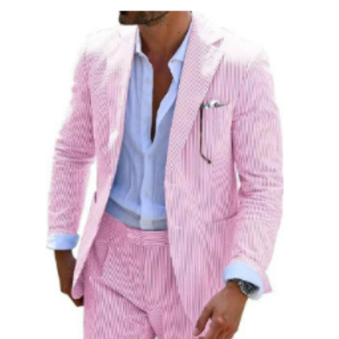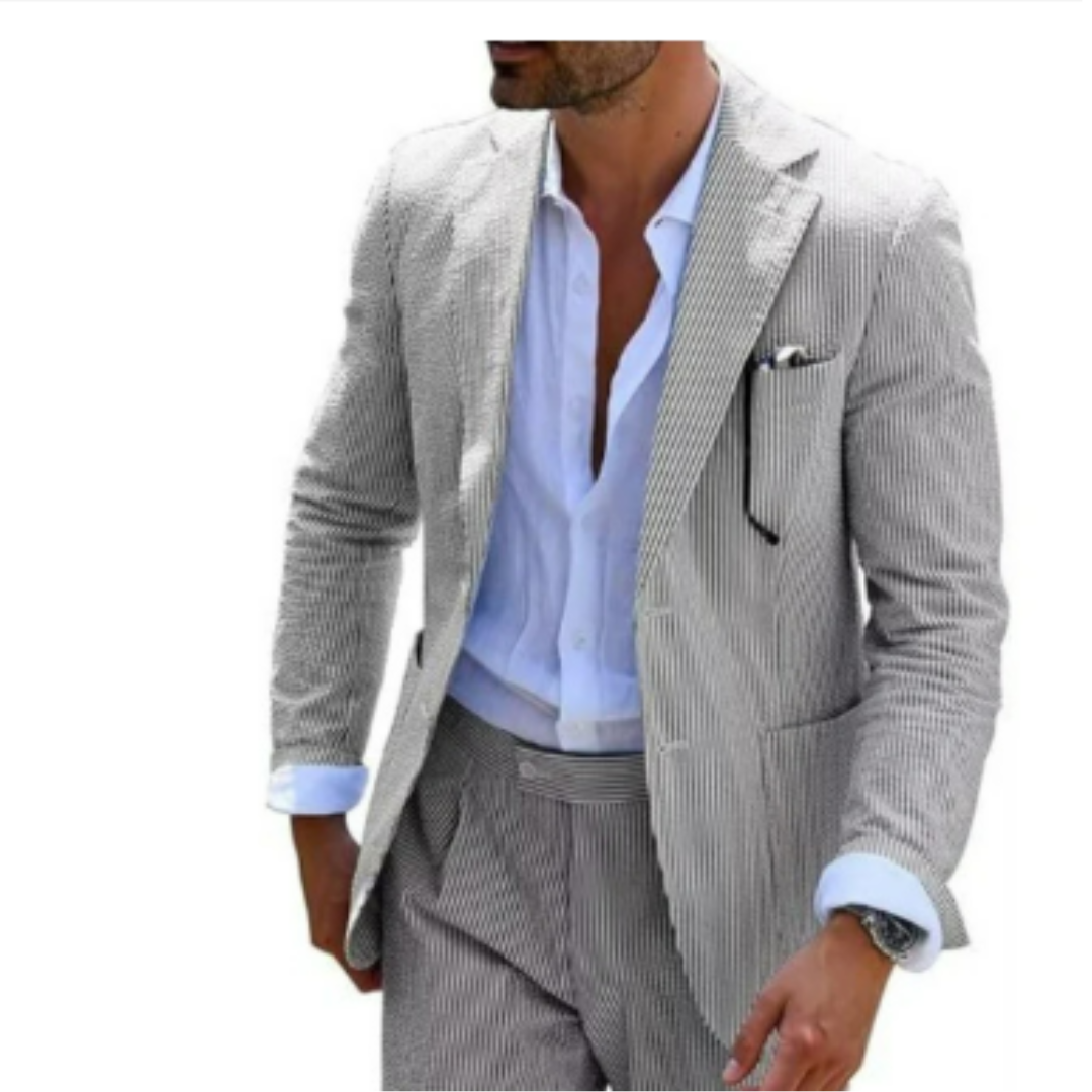Dieser zweireihige Sommeranzug ist der Inbegriff moderner Eleganz. Die leichte Stoffqualität und das markante Design machen ihn zum perfekten Begleiter für Hochzeiten und feierliche Anlässe bei warmem Wetter. Mit seiner edlen Knopfleiste und dem klassischen Schnitt hebt er jeden Look auf das nächste Level.