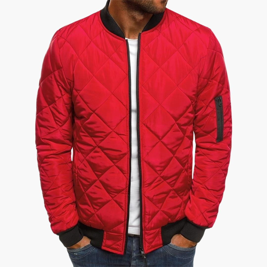 Diese Herren Bomberjacke hat einen kurzen Kragen und einen Reißverschluss an der Vorderseite. Sie verfügt über lange Ärmel mit gerippten Bündchen sowie einen gerippten Saum für eine klare Form. Zum Design gehören zwei Seitentaschen und eine Reißverschlusstasche am Ärmel. Die Oberfläche zeigt ein gestepptes Rautenmuster über den gesamten Körper und die Ärmel.