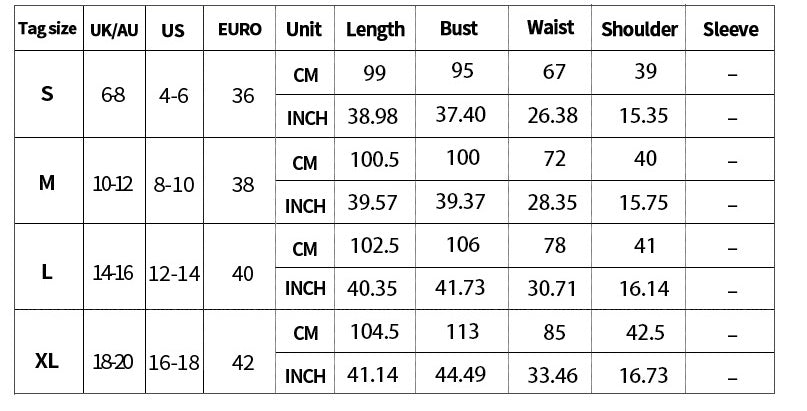 | Größe | Länge (cm) | Brust (cm) | Taille (cm) | Schulter (cm) |
