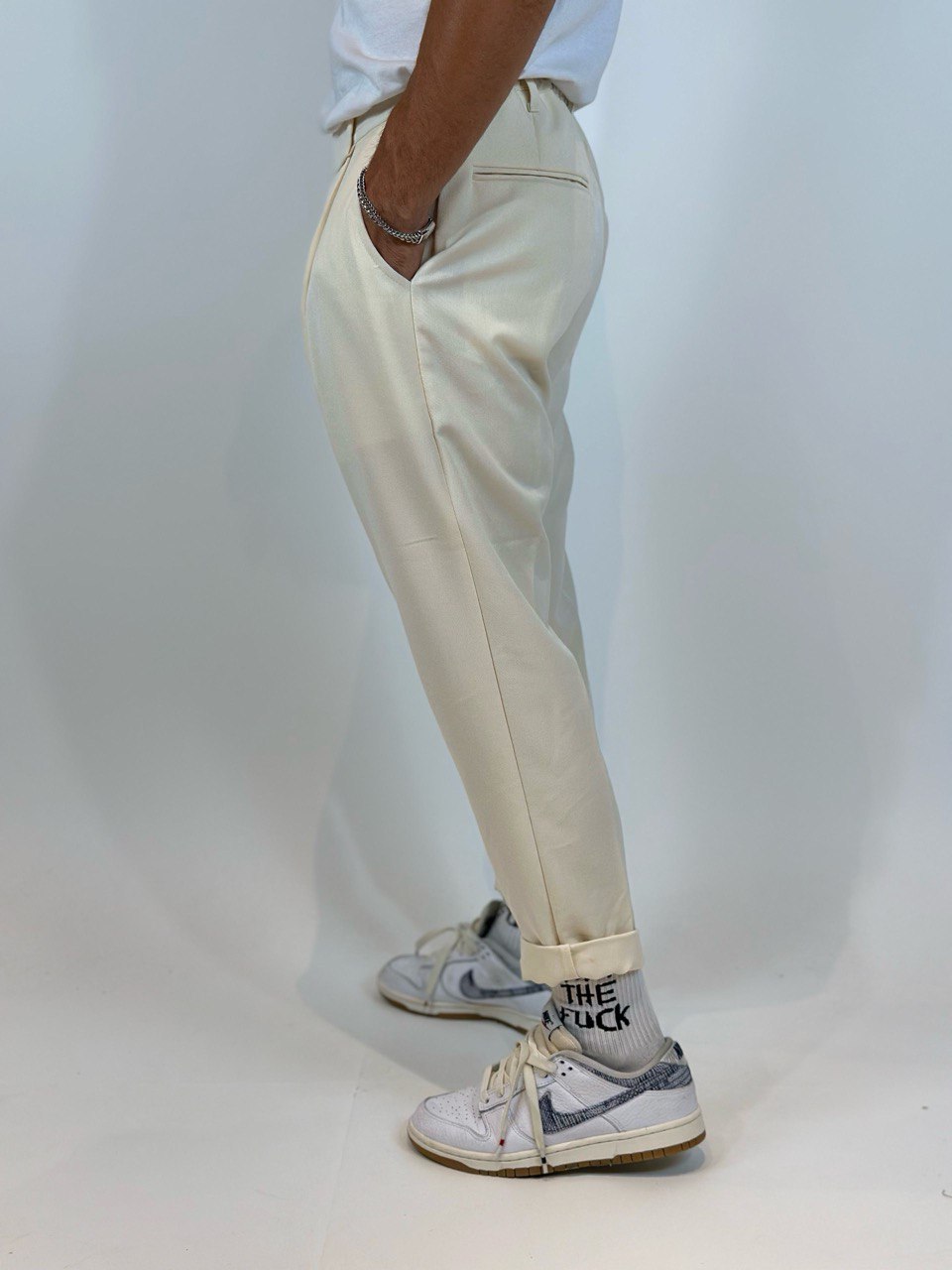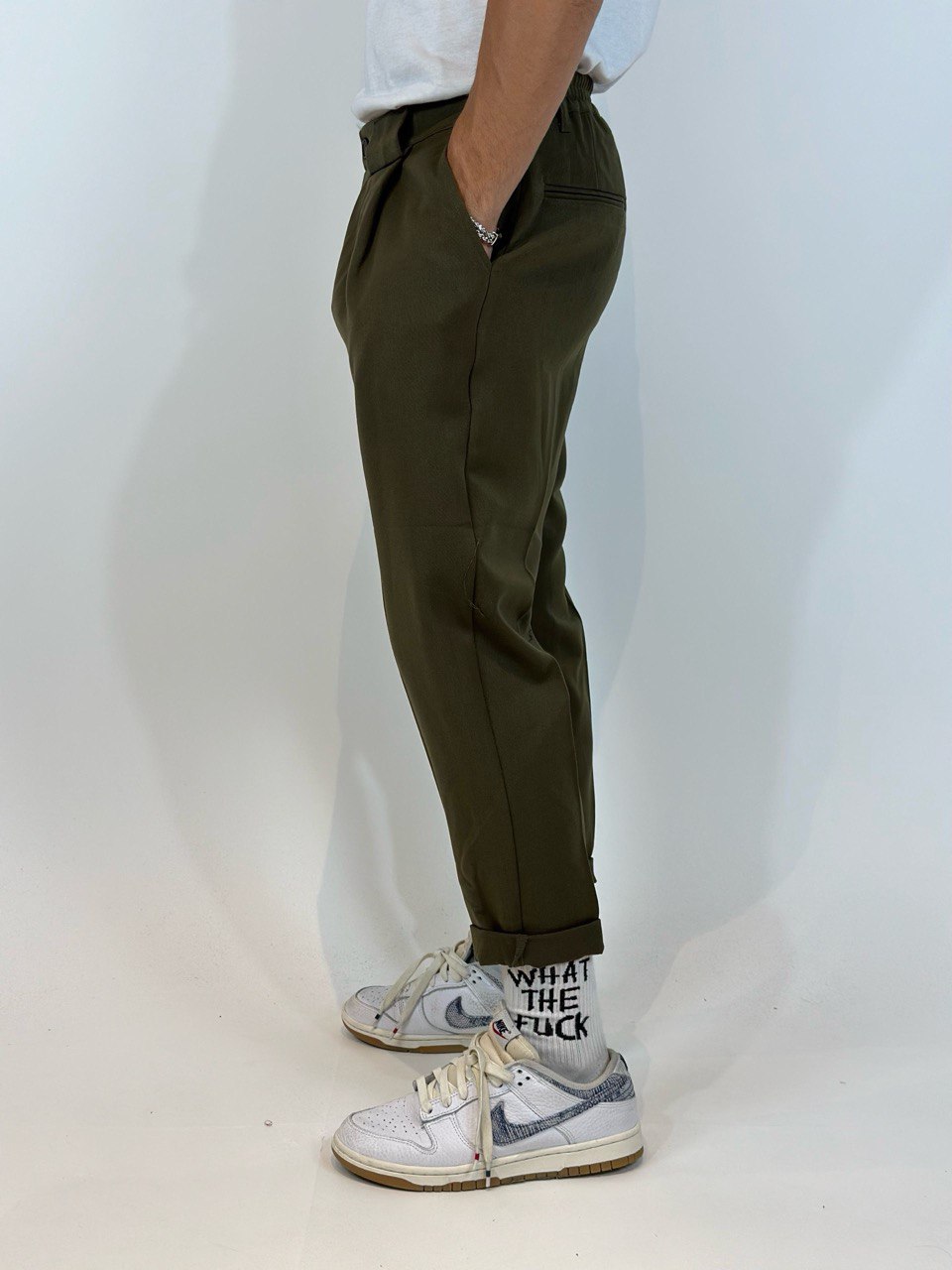 Diese Herren-Hosen bieten ein perfektes Gleichgewicht zwischen Eleganz und Komfort und sind ideal für einen lässig-schicken Look oder ein anspruchsvolleres Outfit. Das schmal geschnittene Design folgt der Beinlinie, ohne zu eng zu sein, während der leicht elastische Stoff Bewegungsfreiheit garantiert. Das Detail mit dem frontalen Knopf und der Reißverschluss sorgen für eine praktische und raffinierte Passform. Die seitlichen Taschen fügen Funktionalität hinzu, ohne die minimalistische Ästhetik des Kleidungsstücks zu beeinträchtigen, während der elastische Bund am Knöchel einen modernen und dynamischen Akzent setzt. Erhältlich in drei vielseitigen Farbtönen – Olivgrün, Schwarz und Beige – lassen sich diese Hosen leicht an verschiedene Stile und Anlässe anpassen.