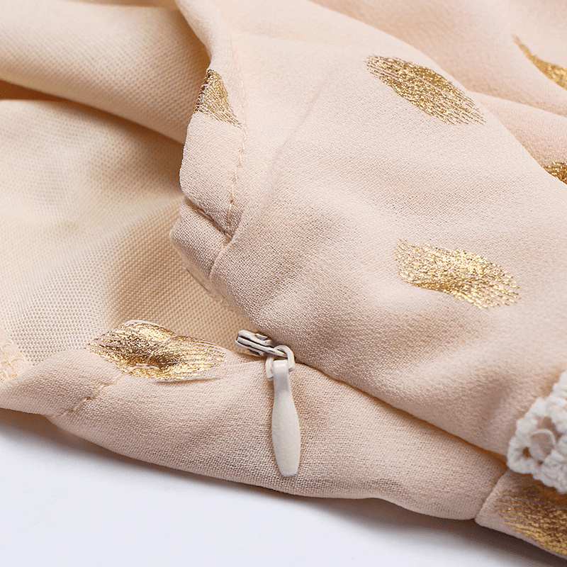 Dieses luftige Maxi-Kleid vereint sommerliche Frische mit stilvollen Details. Feine Spitzenverzierungen und goldene Polka-Dots verleihen ihm eine besondere Eleganz. Der fließende, mehrstufige Rock sorgt für eine anmutige Bewegung und macht es perfekt für warme Tage.