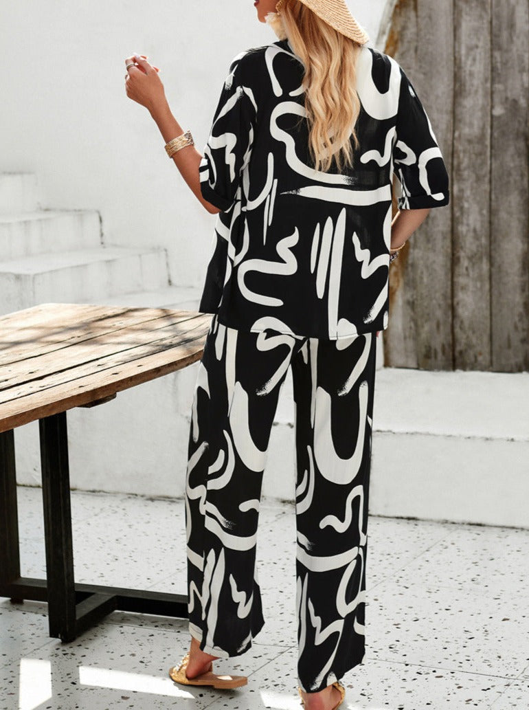 Entdecke unser Thora Bequemes zweiteiliges Set für Damen, bestehend aus einem schwarzen, bedruckten Button-up Hemd und passender Hose. Perfekt für legere Anlässe bietet dieses Set die ideale Balance zwischen Komfort, Stil und Praktikabilität. Ob beim Einkaufen, bei einem entspannten Ausflug oder beim Relaxen zu Hause – dieses Set sorgt dafür, dass du immer mühelos schick aussiehst und dich gleichzeitig wohlfühlst.